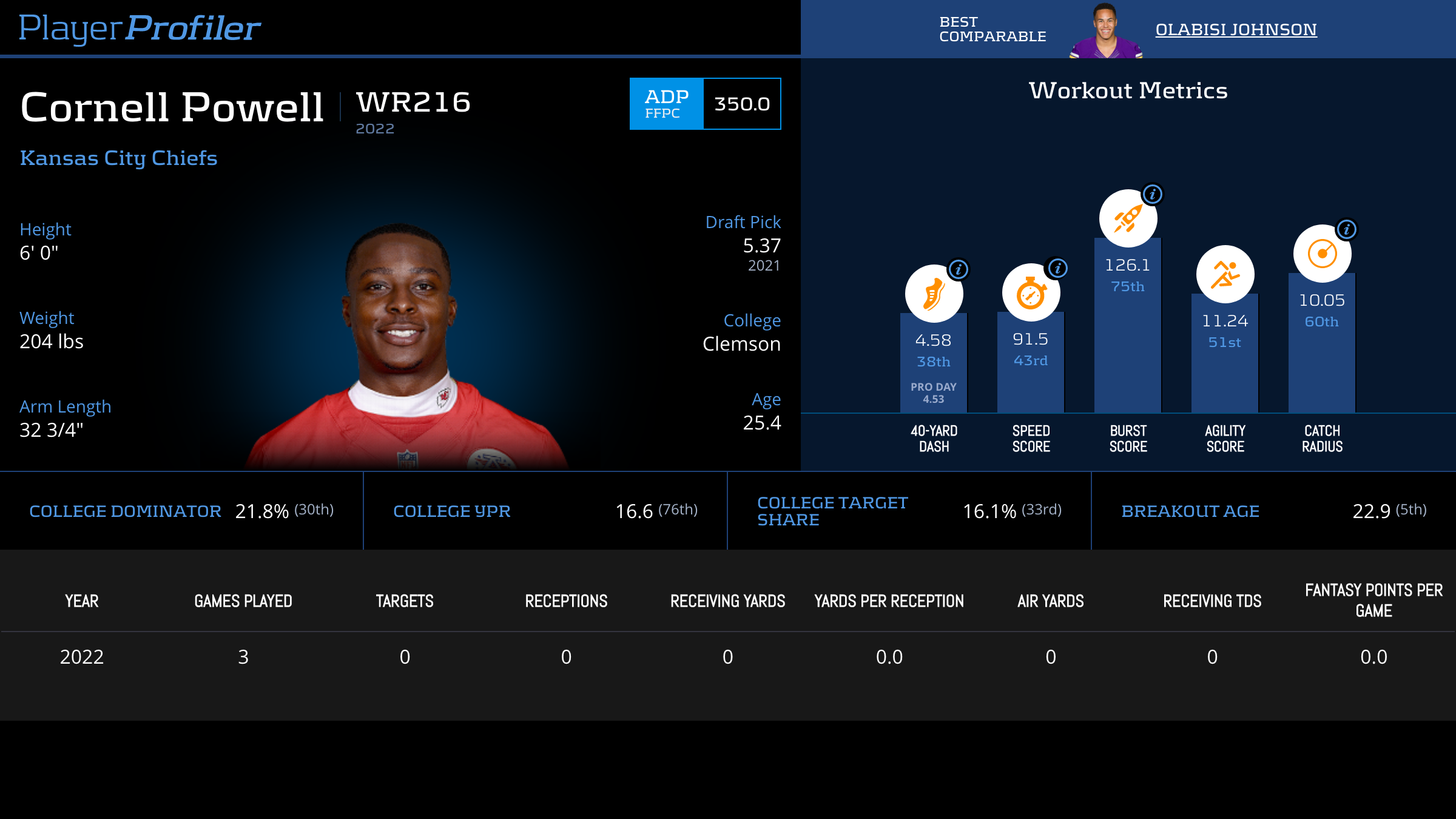 | Year Year | Games Games | Receptions Recs | Receiving Yards Rec Yds | Target Share Tgt Share | Catch Rate Catch Rate | Receiving Touchdowns Rec TDs | Special Teams Yards Special Teams | Age Age | School School |