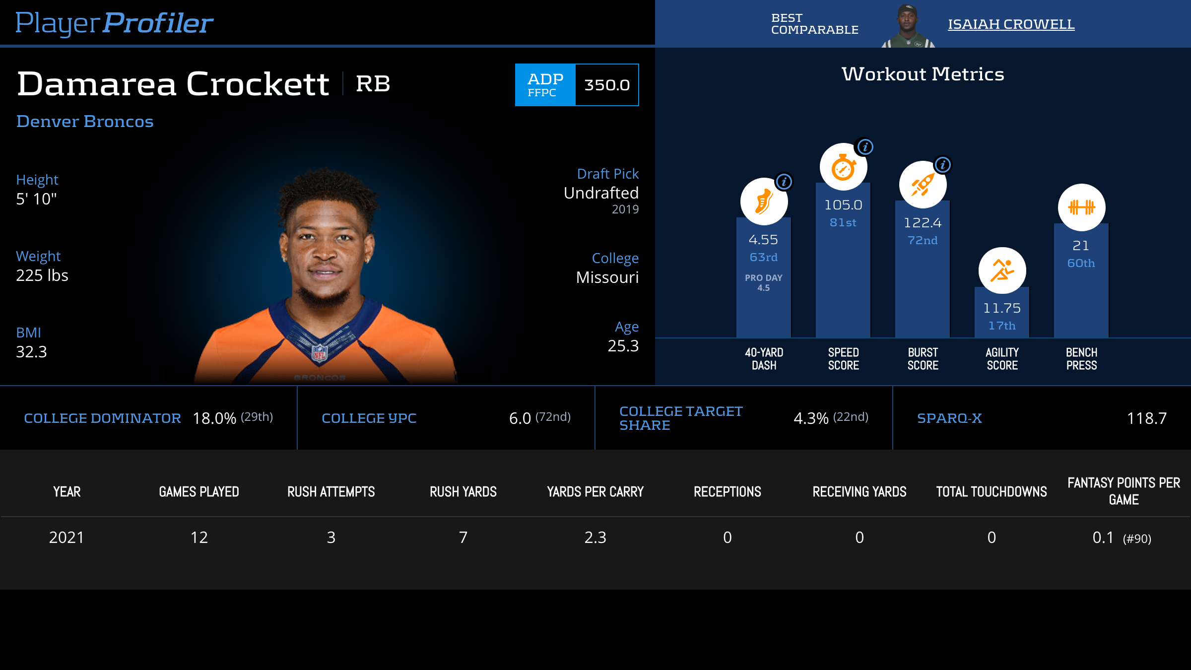 | Year Year | Games Games | Rush Attempts Rush Atts | Rushing Yards Rush Yrds | Total Touchdowns TDs | Receptions Rec | Receiving Yards Rec Yrds | Target Share Tgt Share | Age Age | School School |
