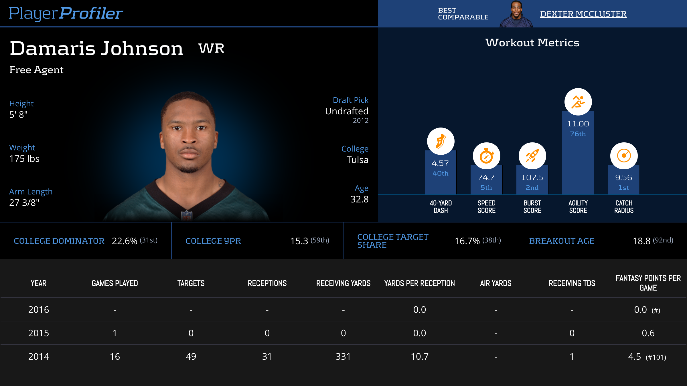 | Year Year | Games Games | Receptions Recs | Receiving Yards Rec Yds | Target Share Tgt Share | Catch Rate Catch Rate | Receiving Touchdowns Rec TDs | Special Teams Yards Special Teams | Age Age | School School |