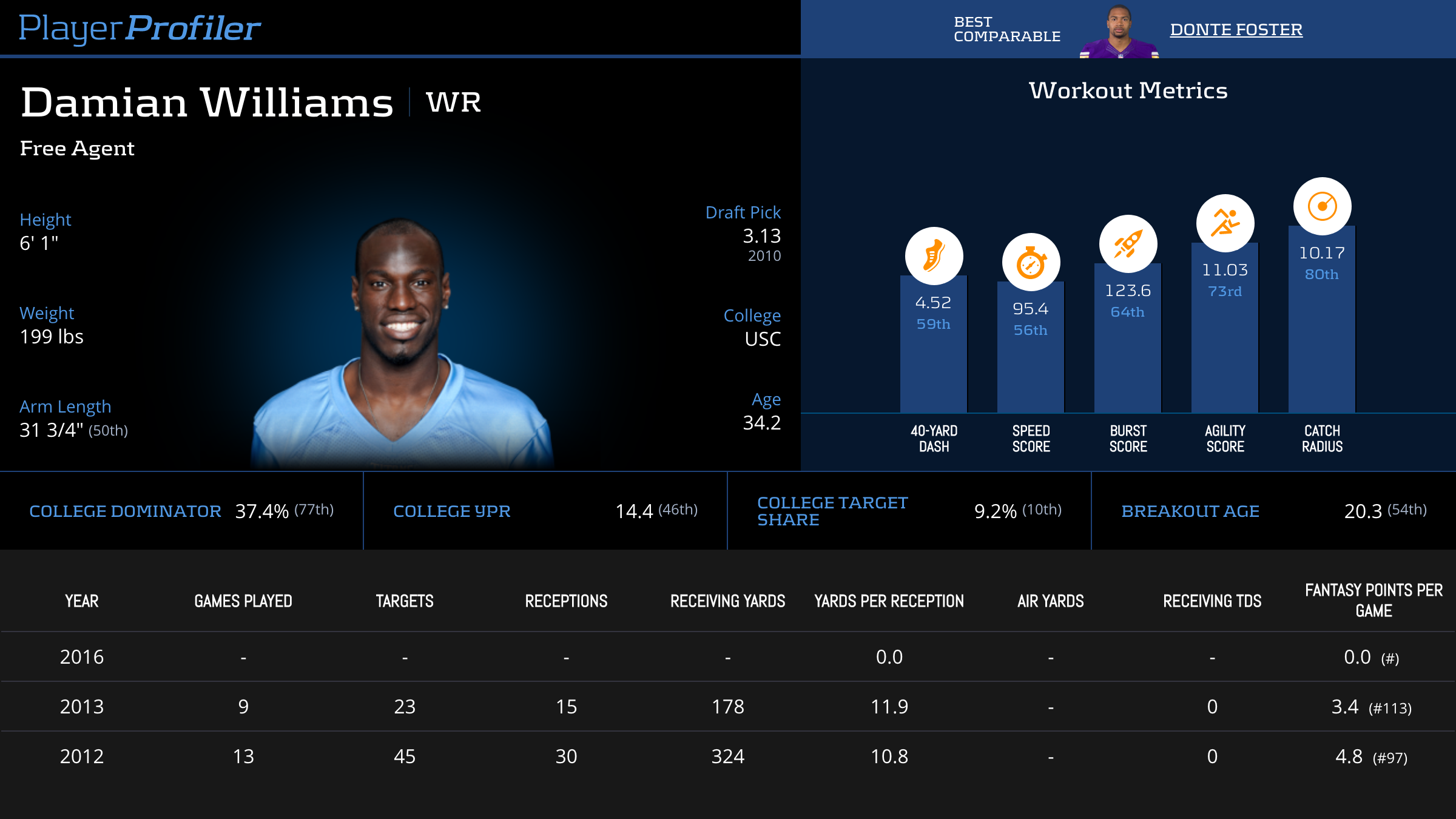 | Year Year | Games Games | Receptions Recs | Receiving Yards Rec Yds | Target Share Tgt Share | Catch Rate Catch Rate | Receiving Touchdowns Rec TDs | Special Teams Yards Special Teams | Age Age | School School |