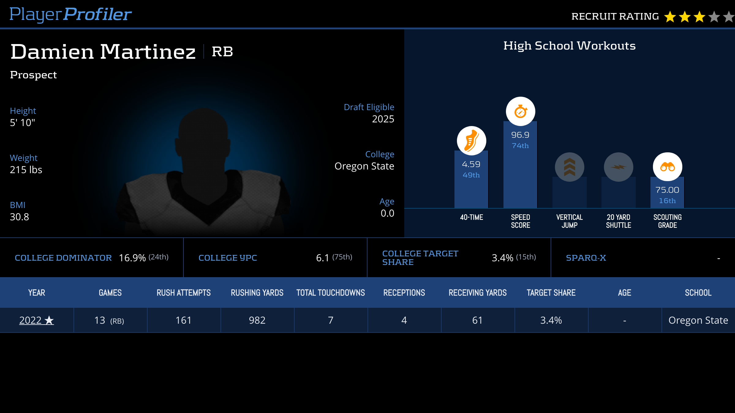 | Year Year | Games Games | Rush Attempts Rush Atts | Rushing Yards Rush Yrds | Total Touchdowns TDs | Receptions Rec | Receiving Yards Rec Yrds | Target Share Tgt Share | Age Age | School School |