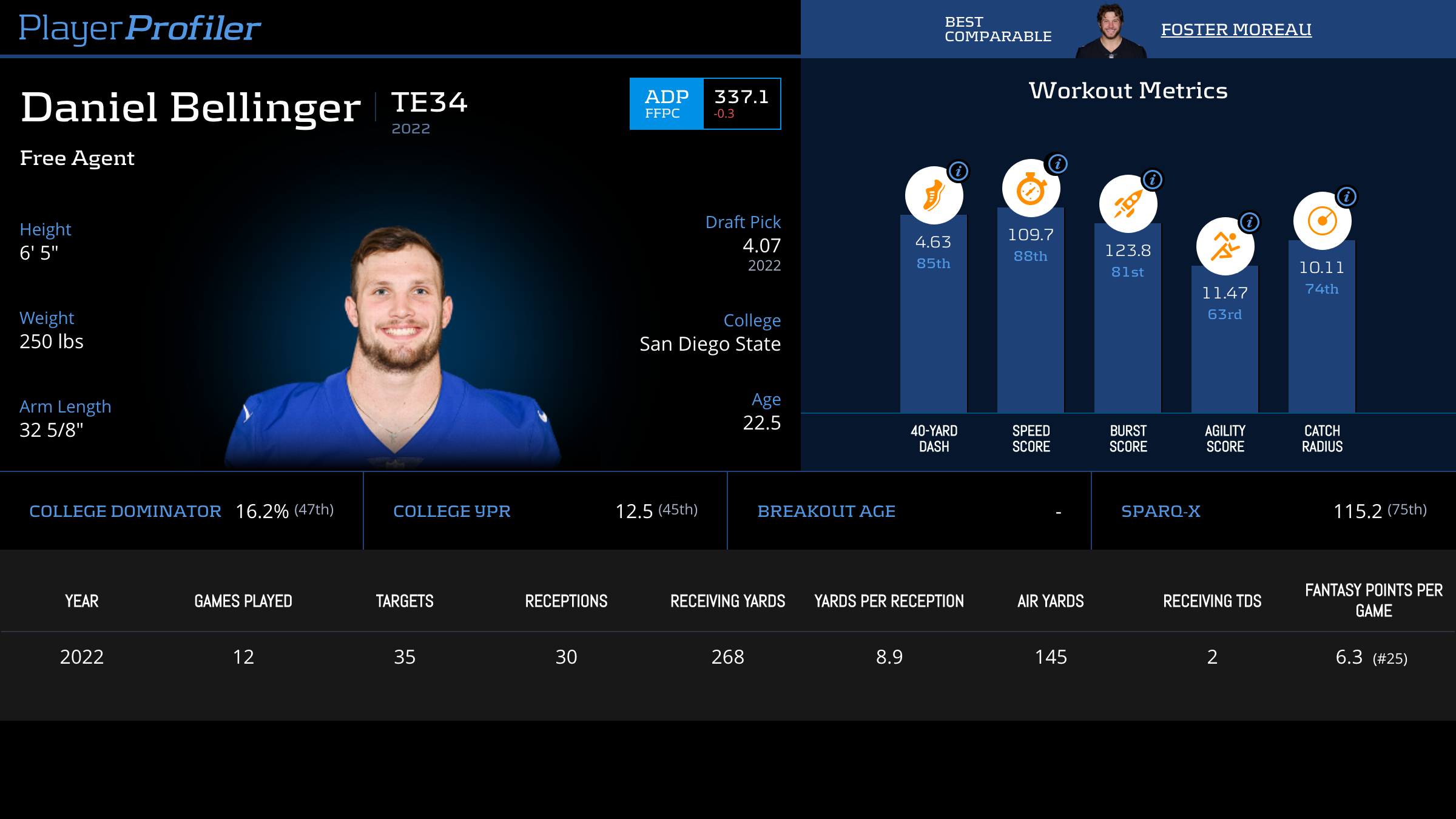 Box score statistics such as targets, yards, touchdowns, and fantasy points per target are updated the next day. Advanced stats and metrics are updated later in the week during the NFL season.