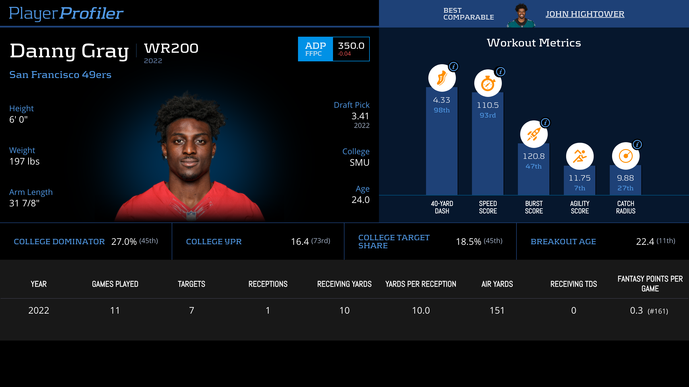 | Year Year | Games Games | Receptions Recs | Receiving Yards Rec Yds | Target Share Tgt Share | Catch Rate Catch Rate | Receiving Touchdowns Rec TDs | Special Teams Yards Special Teams | Age Age | School School |