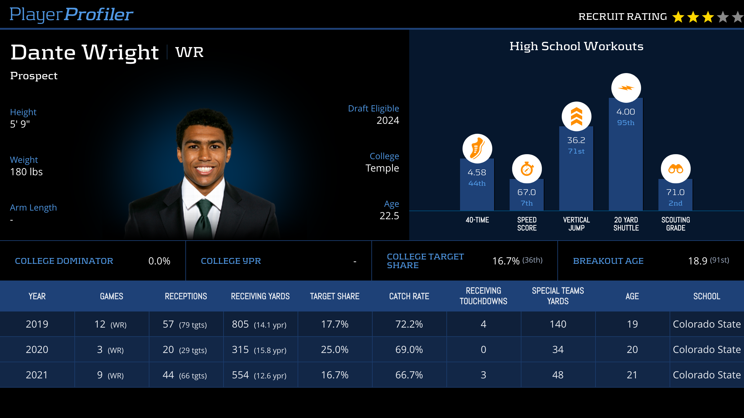 | Year Year | Games Games | Receptions Recs | Receiving Yards Rec Yds | Target Share Tgt Share | Catch Rate Catch Rate | Receiving Touchdowns Rec TDs | Special Teams Yards Special Teams | Age Age | School School |