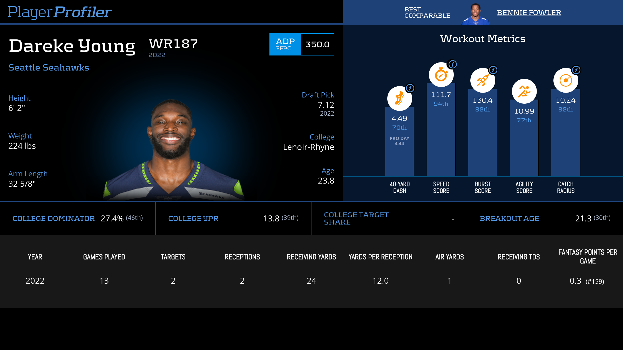 | Year Year | Games Games | Receptions Recs | Receiving Yards Rec Yds | Target Share Tgt Share | Catch Rate Catch Rate | Receiving Touchdowns Rec TDs | Special Teams Yards Special Teams | Age Age | School School |