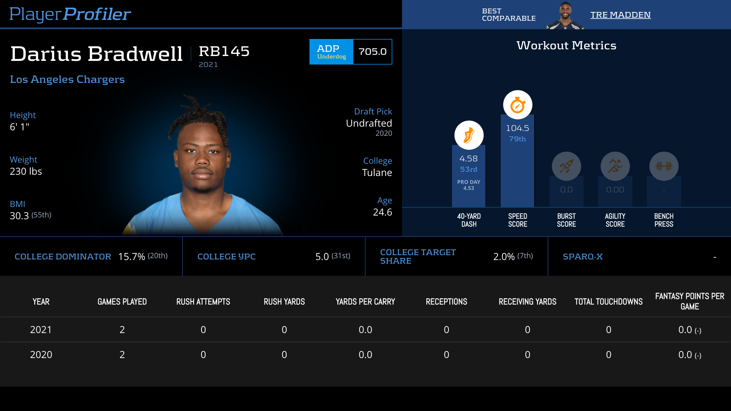 | Year Year | Games Games | Rush Attempts Rush Atts | Rushing Yards Rush Yrds | Total Touchdowns TDs | Receptions Rec | Receiving Yards Rec Yrds | Target Share Tgt Share | Age Age | School School |