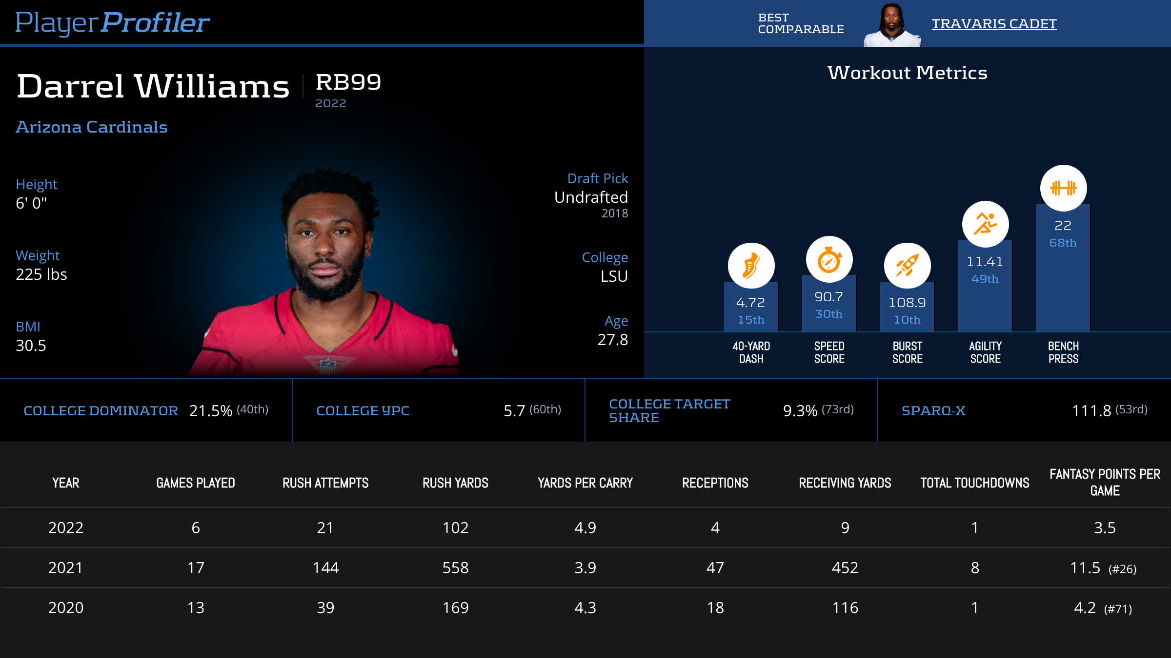 | Year Year | Games Games | Rush Attempts Rush Atts | Rushing Yards Rush Yrds | Total Touchdowns TDs | Receptions Rec | Receiving Yards Rec Yrds | Target Share Tgt Share | Age Age | School School |