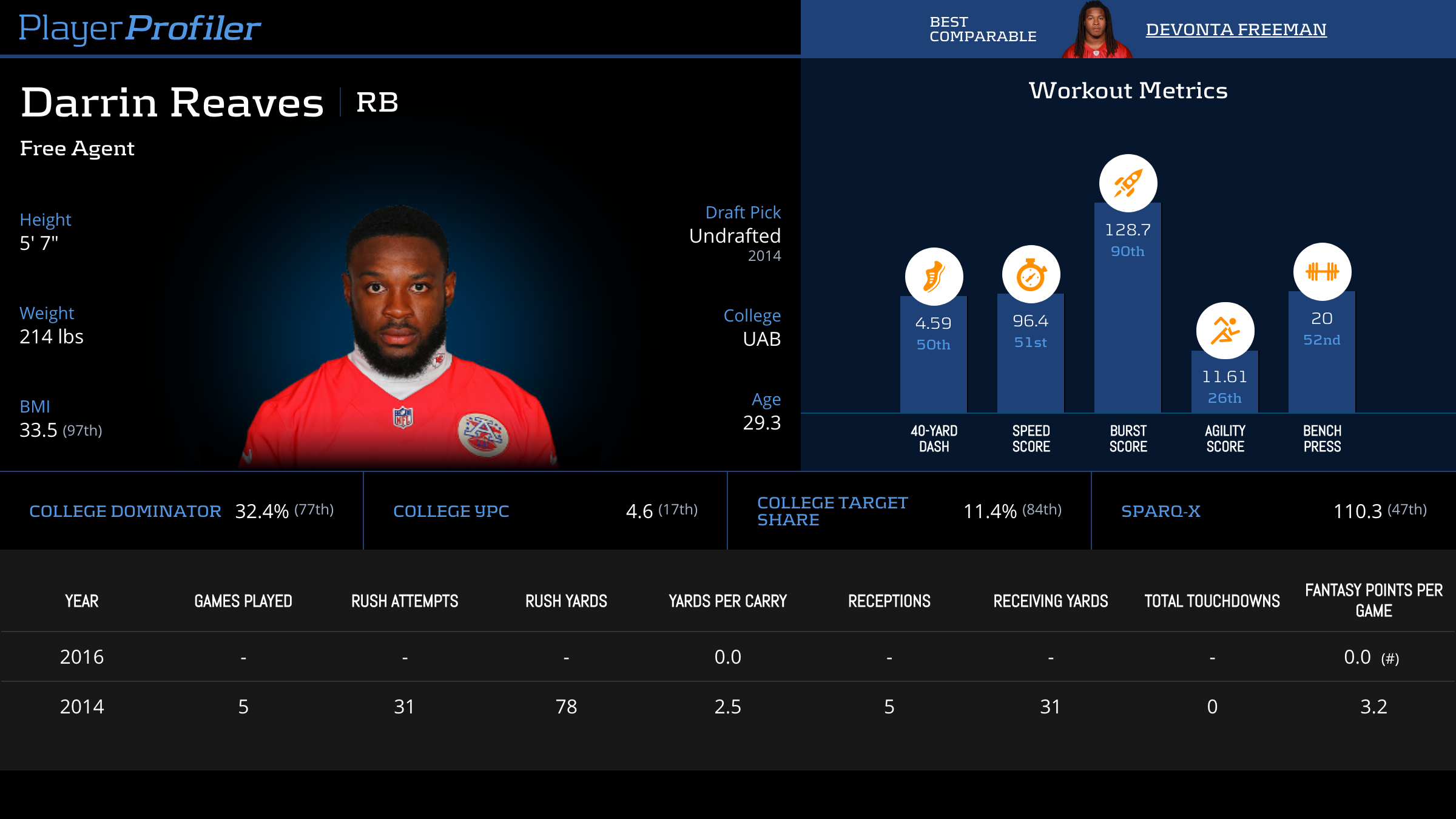 | Year Year | Games Games | Rush Attempts Rush Atts | Rushing Yards Rush Yrds | Total Touchdowns TDs | Receptions Rec | Receiving Yards Rec Yrds | Target Share Tgt Share | Age Age | School School |