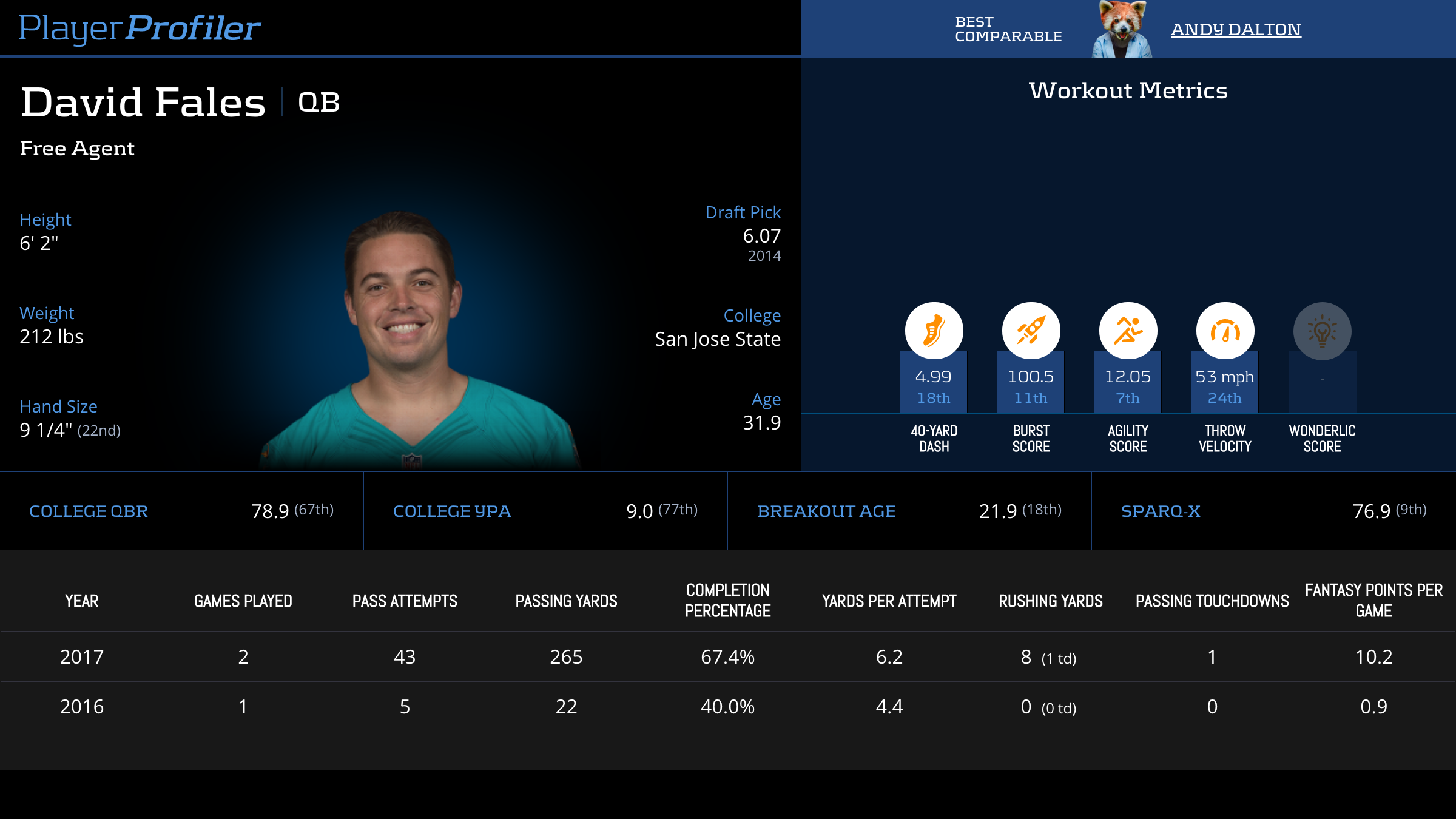| 17 | BUF | 42 | 69.0% | 265 | 6.3 | 1 (1 int) | 8 | 1 | 20.4 (##6) |