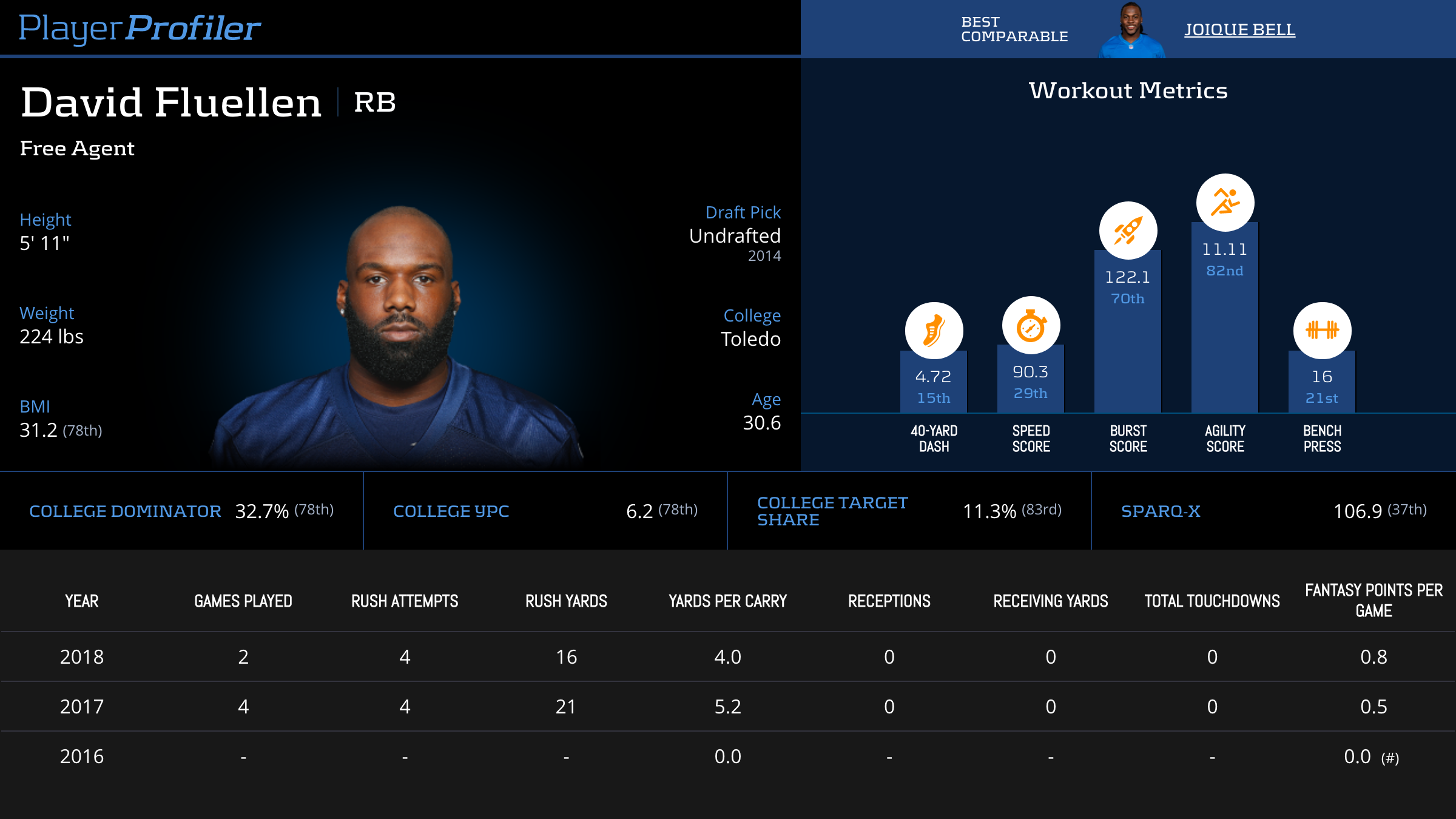 | Year Year | Games Games | Rush Attempts Rush Atts | Rushing Yards Rush Yrds | Total Touchdowns TDs | Receptions Rec | Receiving Yards Rec Yrds | Target Share Tgt Share | Age Age | School School |