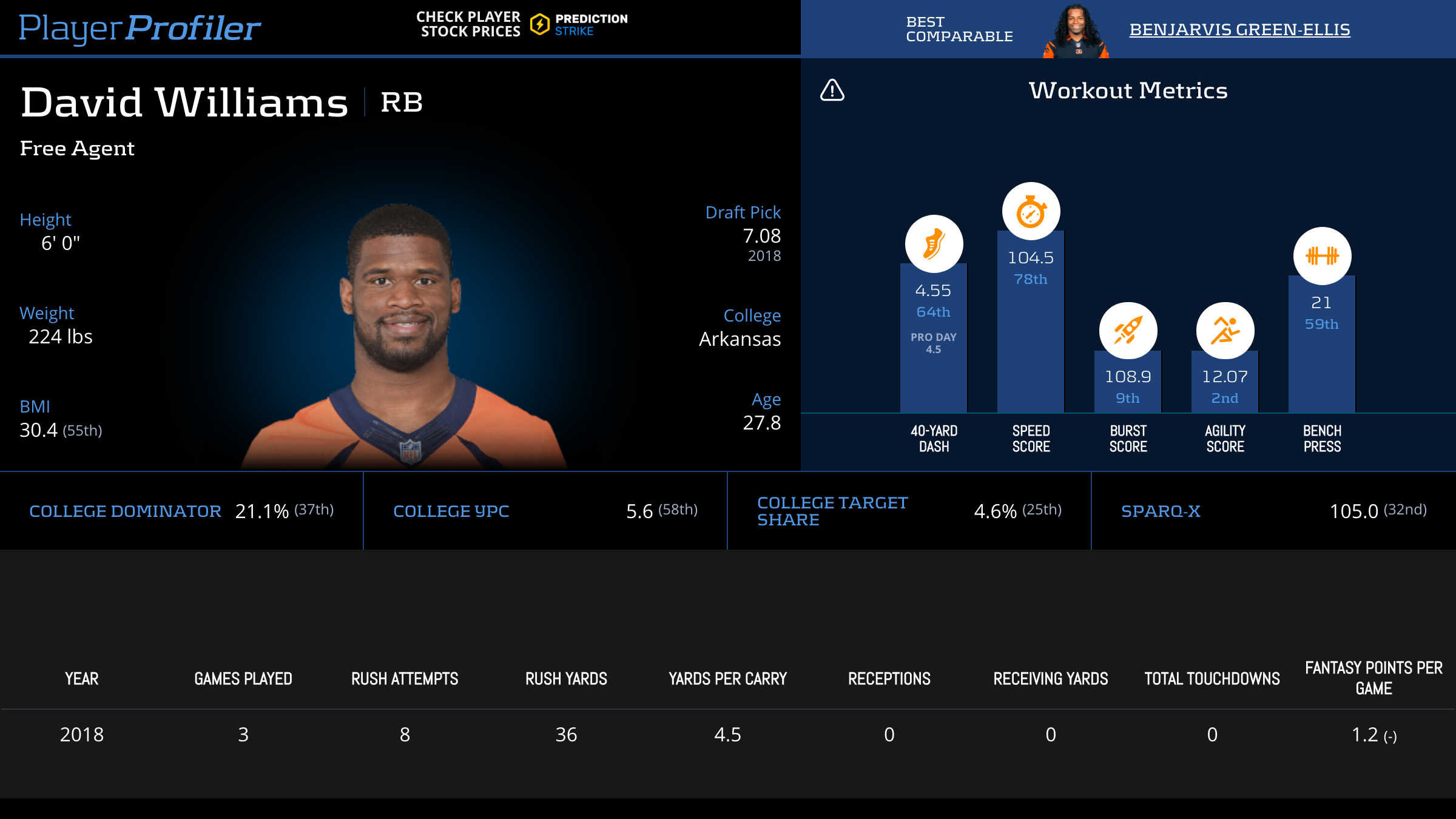 | Year Year | Games Games | Rush Attempts Rush Atts | Rushing Yards Rush Yrds | Total Touchdowns TDs | Receptions Rec | Receiving Yards Rec Yrds | Target Share Tgt Share | Age Age | School School |