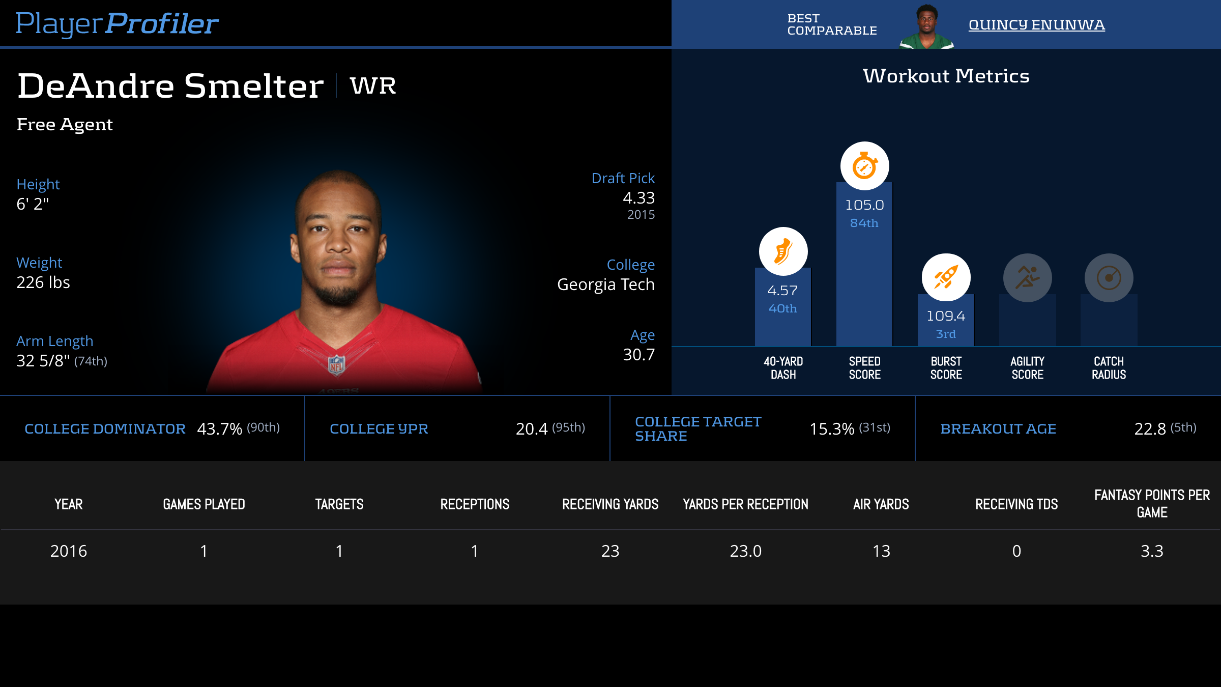 Box score statistics such as targets, yards, touchdowns, and fantasy points per target are updated the next day. Advanced stats and metrics are updated later in the week during the NFL season.