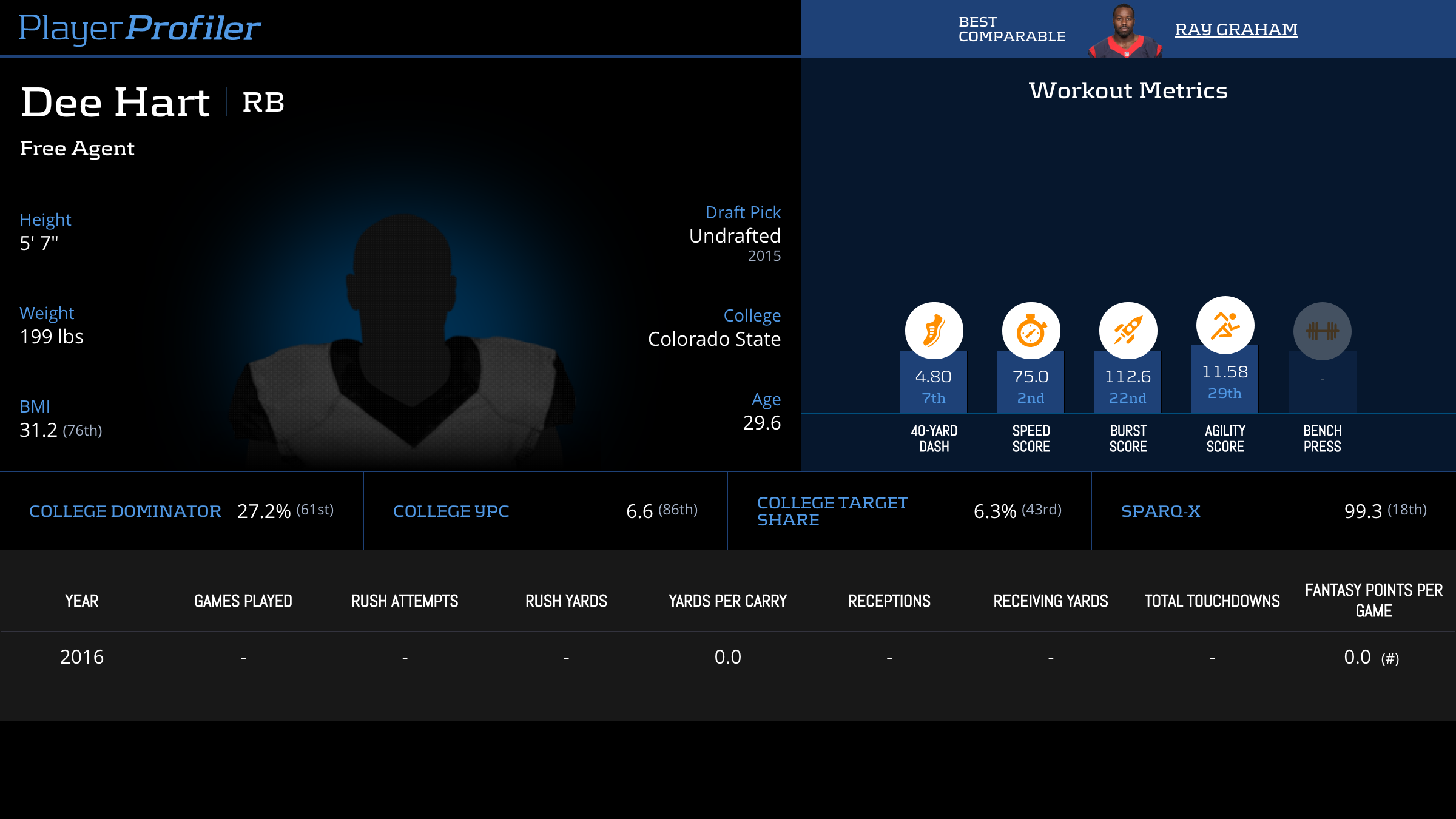 | Year Year | Games Games | Rush Attempts Rush Atts | Rushing Yards Rush Yrds | Total Touchdowns TDs | Receptions Rec | Receiving Yards Rec Yrds | Target Share Tgt Share | Age Age | School School |