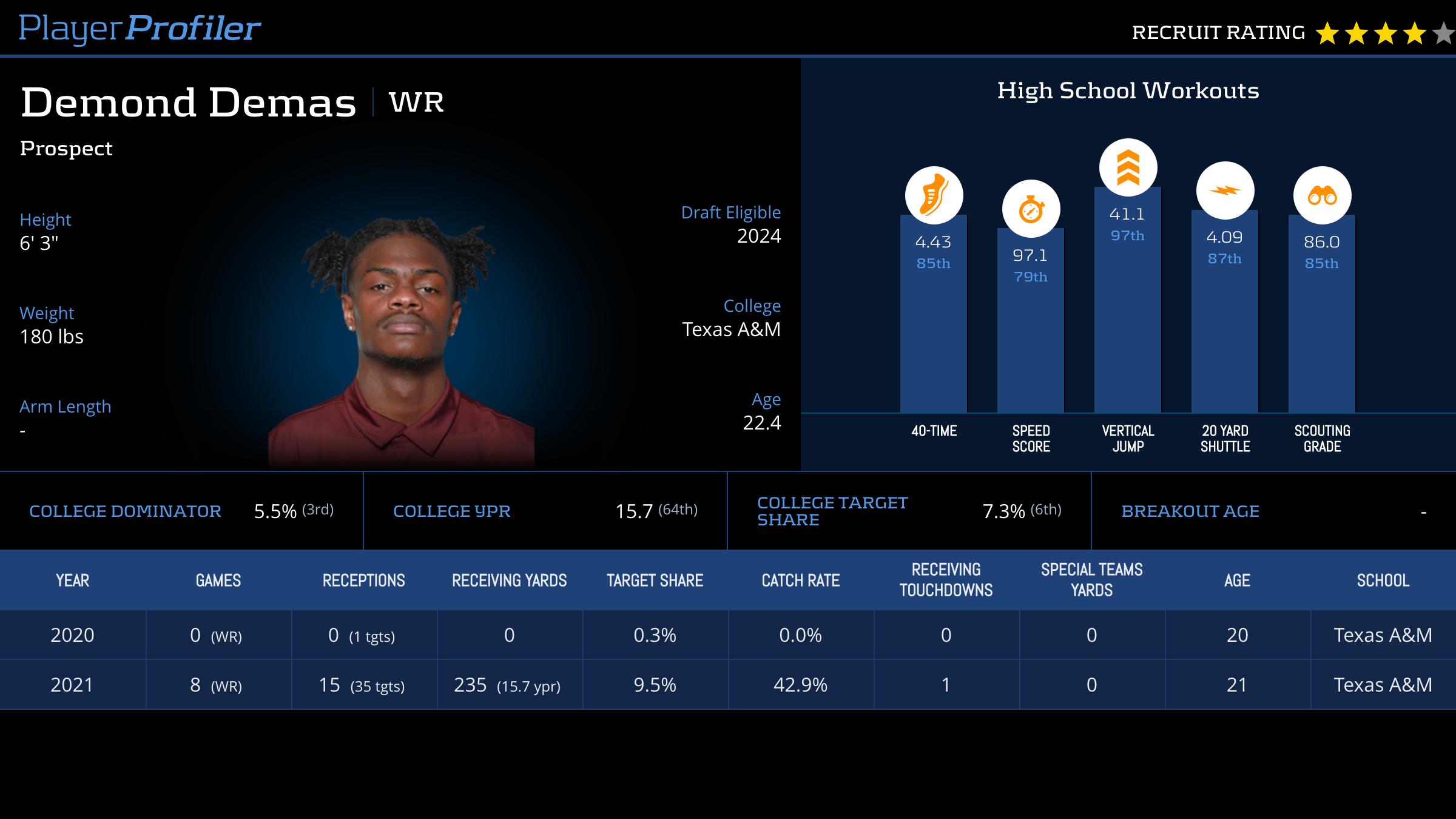 | Year Year | Games Games | Receptions Recs | Receiving Yards Rec Yds | Target Share Tgt Share | Catch Rate Catch Rate | Receiving Touchdowns Rec TDs | Special Teams Yards Special Teams | Age Age | School School |