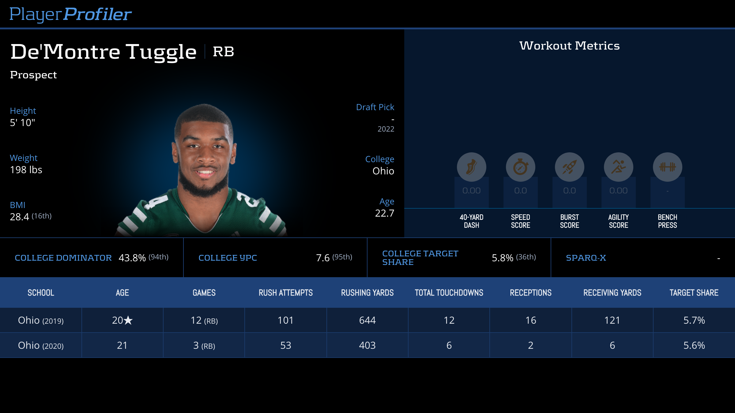 | Year Year | Games Games | Rush Attempts Rush Atts | Rushing Yards Rush Yrds | Total Touchdowns TDs | Receptions Rec | Receiving Yards Rec Yrds | Target Share Tgt Share | Age Age | School School |