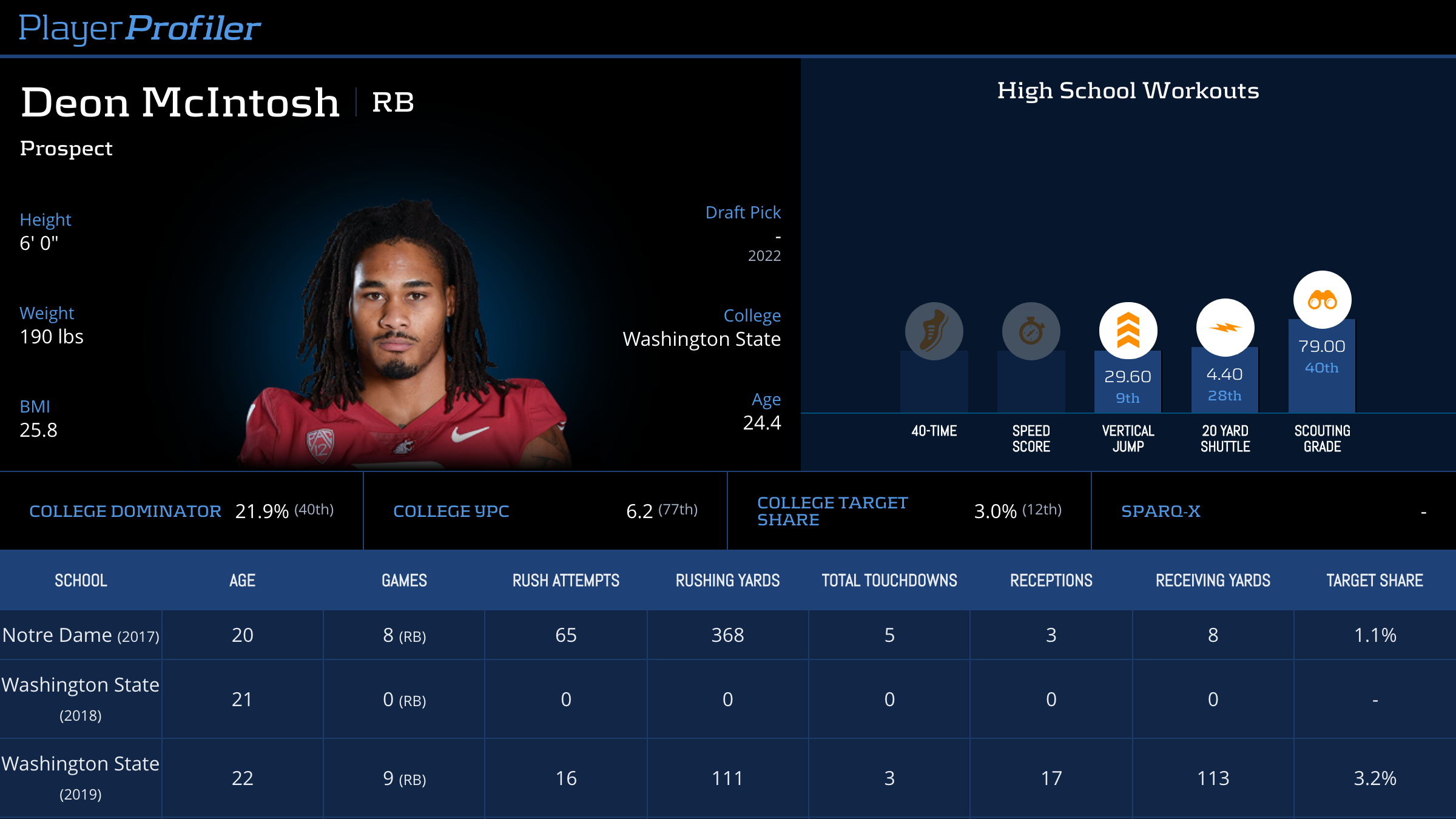 | Year Year | Games Games | Rush Attempts Rush Atts | Rushing Yards Rush Yrds | Total Touchdowns TDs | Receptions Rec | Receiving Yards Rec Yrds | Target Share Tgt Share | Age Age | School School |