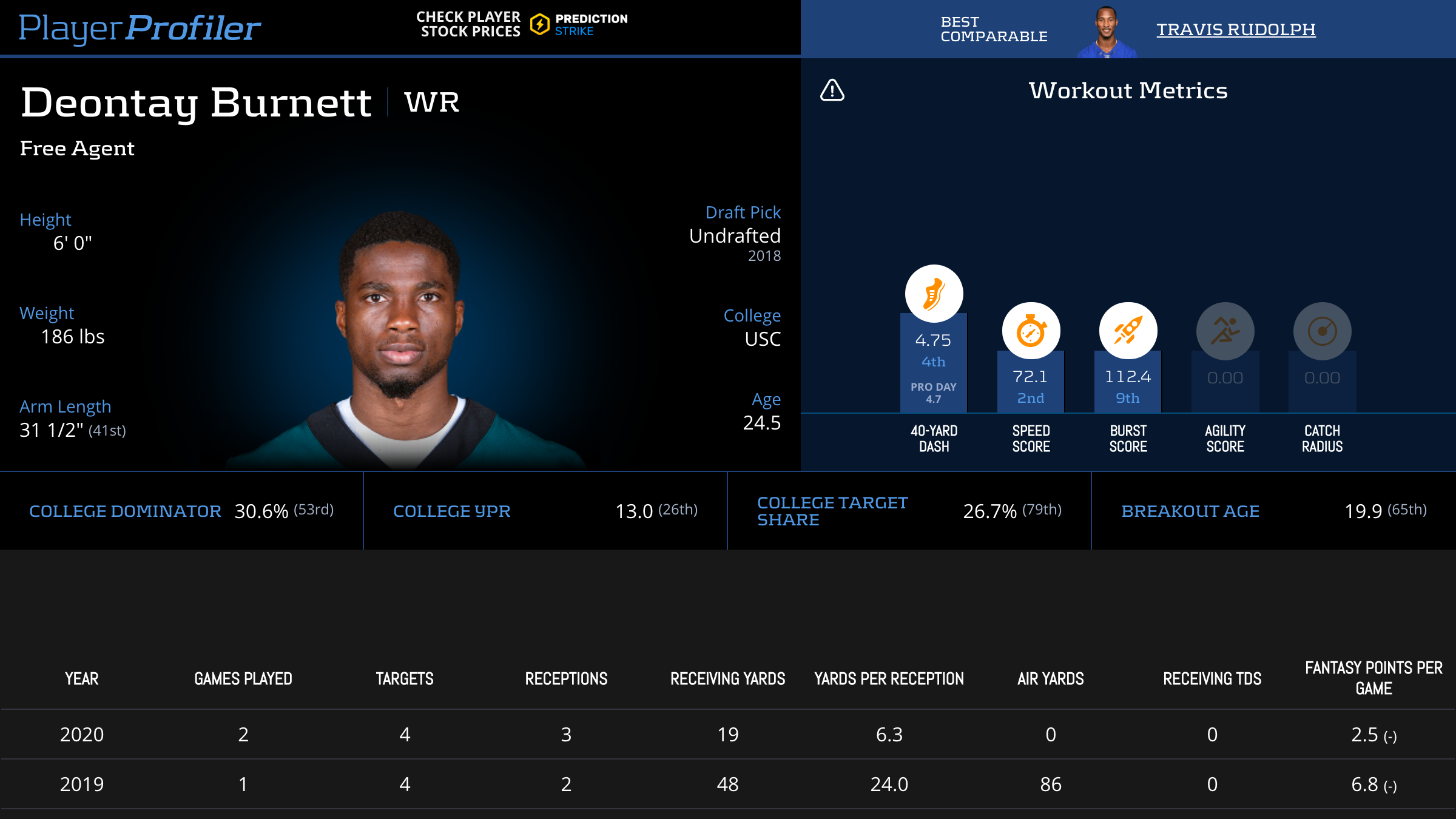 | Year Year | Games Games | Receptions Recs | Receiving Yards Rec Yds | Target Share Tgt Share | Catch Rate Catch Rate | Receiving Touchdowns Rec TDs | Special Teams Yards Special Teams | Age Age | School School |