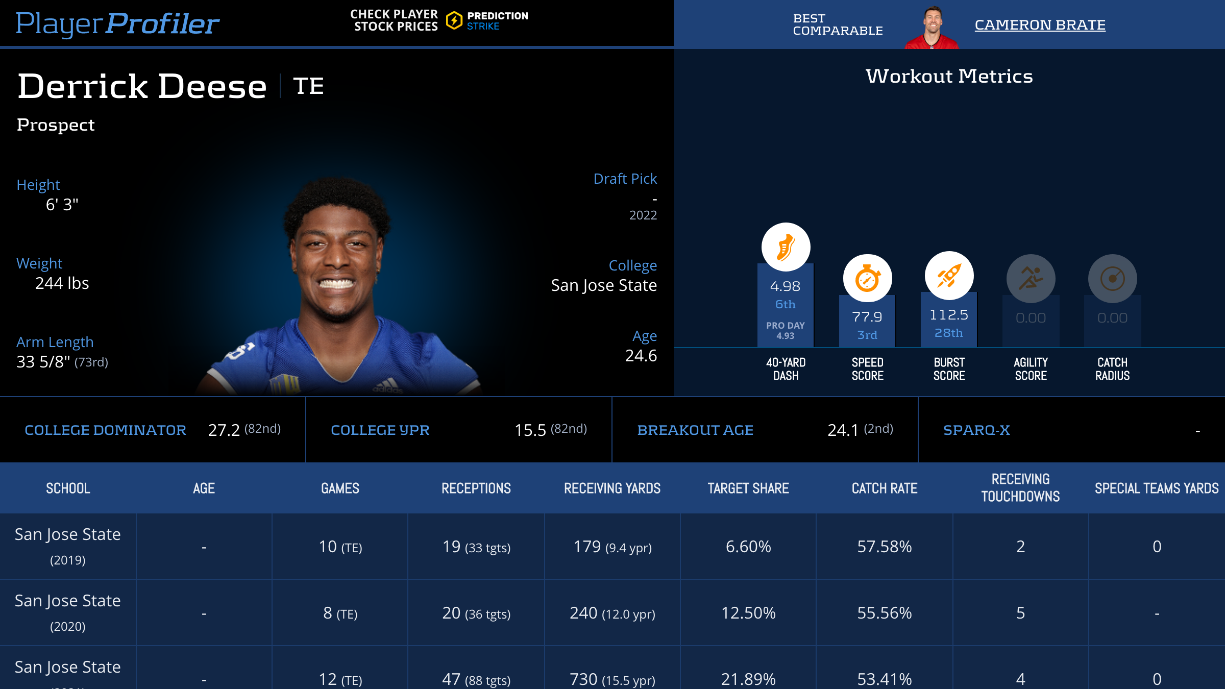 Year Games Recs Rec Yds Tgt Share Catch Rate Rec TDs Special Teams Age School