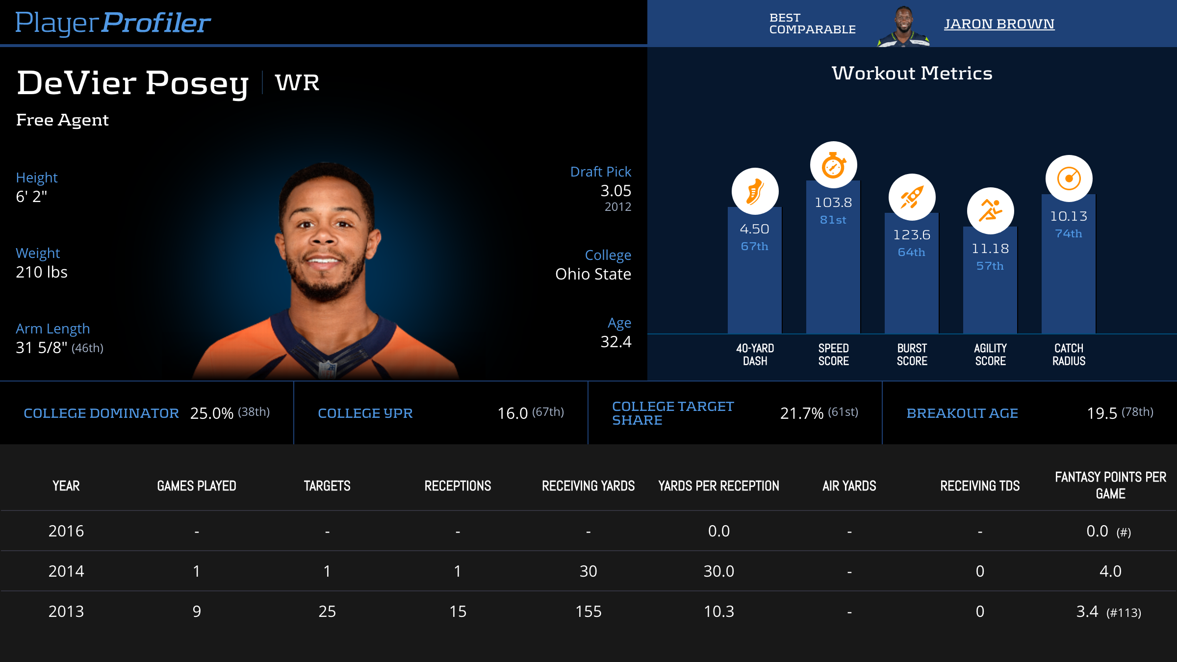 | Year Year | Games Games | Receptions Recs | Receiving Yards Rec Yds | Target Share Tgt Share | Catch Rate Catch Rate | Receiving Touchdowns Rec TDs | Special Teams Yards Special Teams | Age Age | School School |