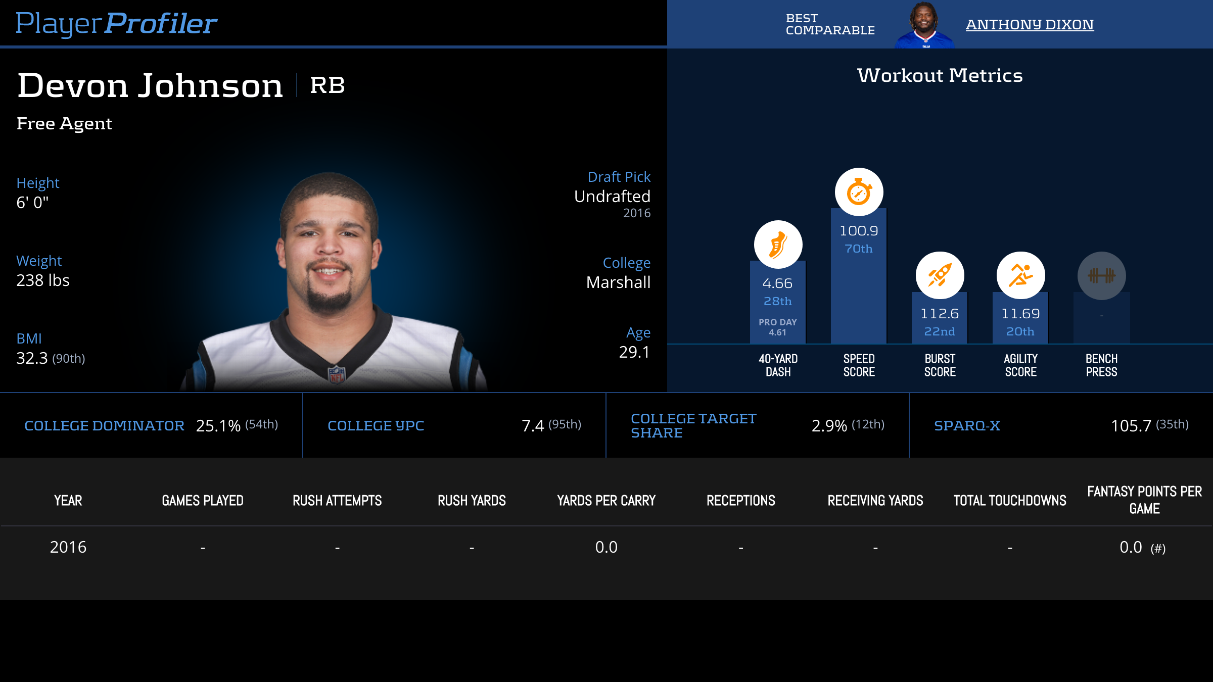 | Year Year | Games Games | Rush Attempts Rush Atts | Rushing Yards Rush Yrds | Total Touchdowns TDs | Receptions Rec | Receiving Yards Rec Yrds | Target Share Tgt Share | Age Age | School School |