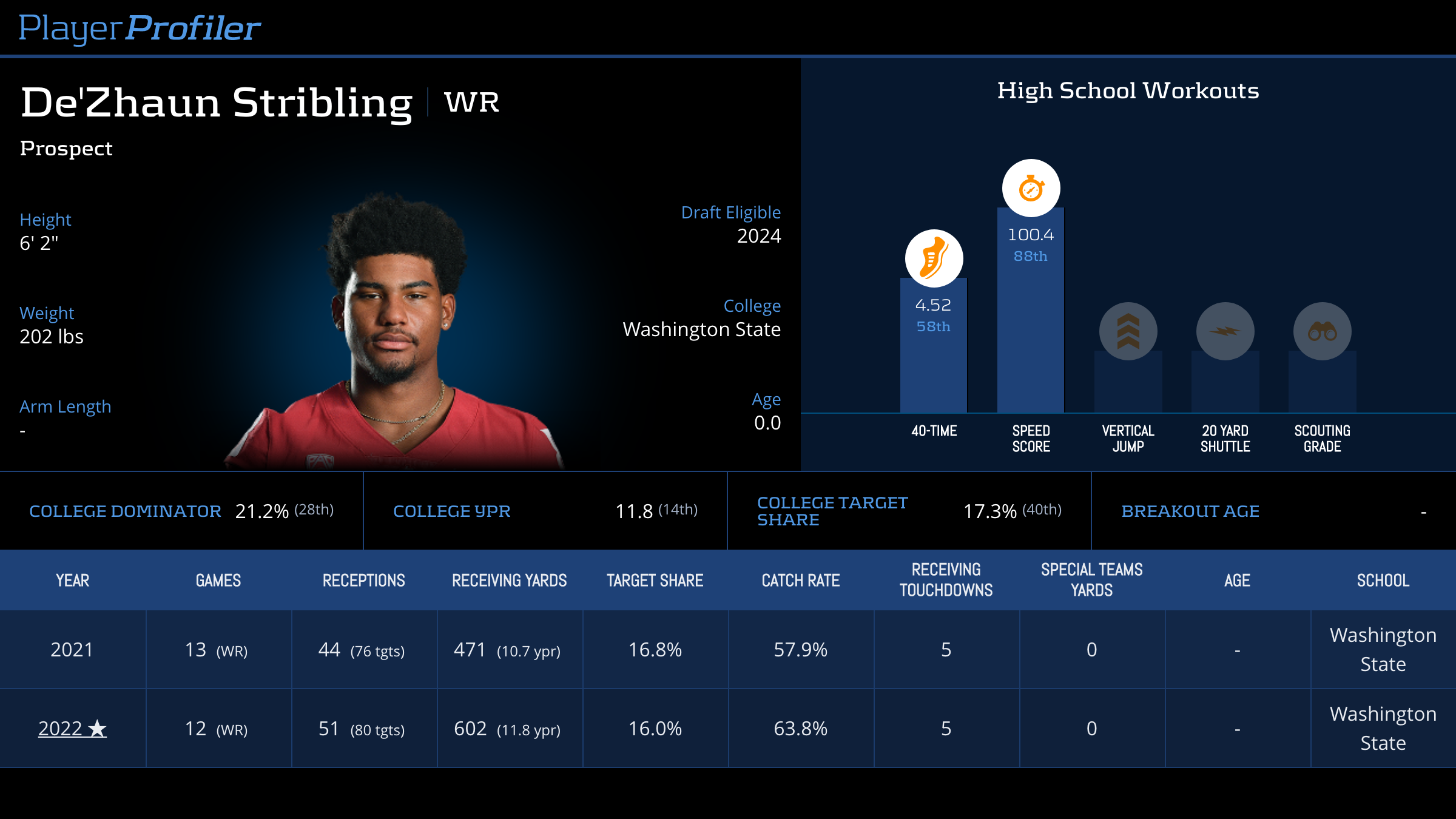 | Year Year | Games Games | Receptions Recs | Receiving Yards Rec Yds | Target Share Tgt Share | Catch Rate Catch Rate | Receiving Touchdowns Rec TDs | Special Teams Yards Special Teams | Age Age | School School |