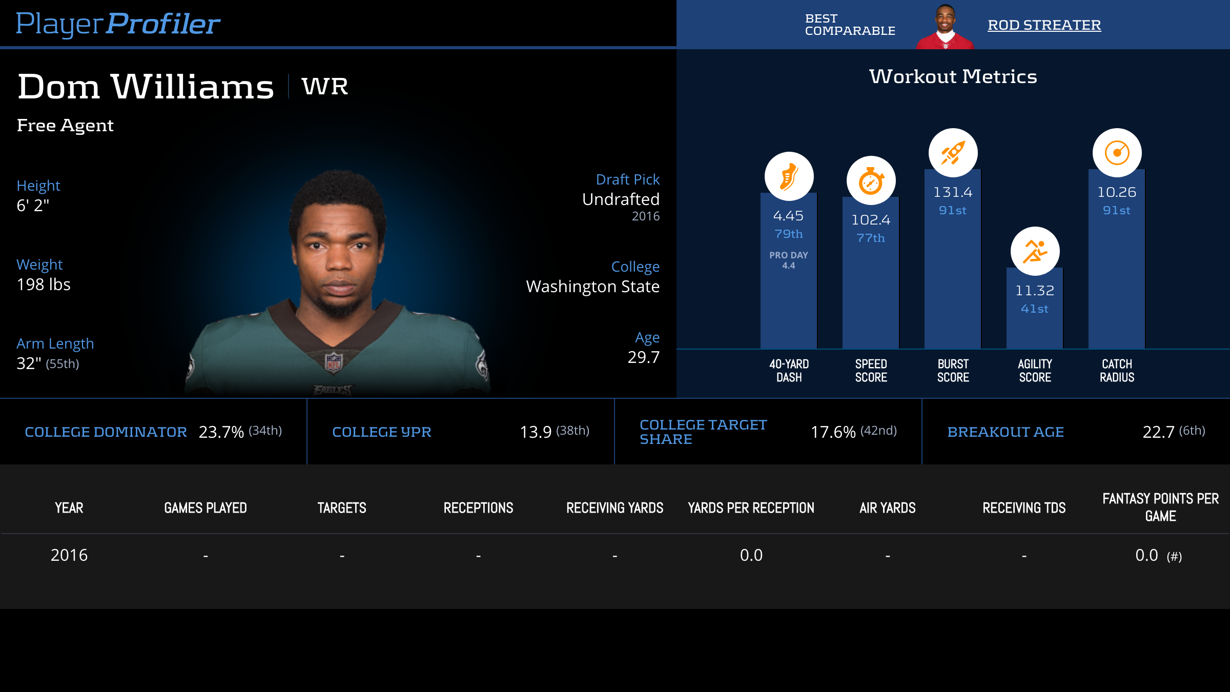 | Year Year | Games Games | Receptions Recs | Receiving Yards Rec Yds | Target Share Tgt Share | Catch Rate Catch Rate | Receiving Touchdowns Rec TDs | Special Teams Yards Special Teams | Age Age | School School |