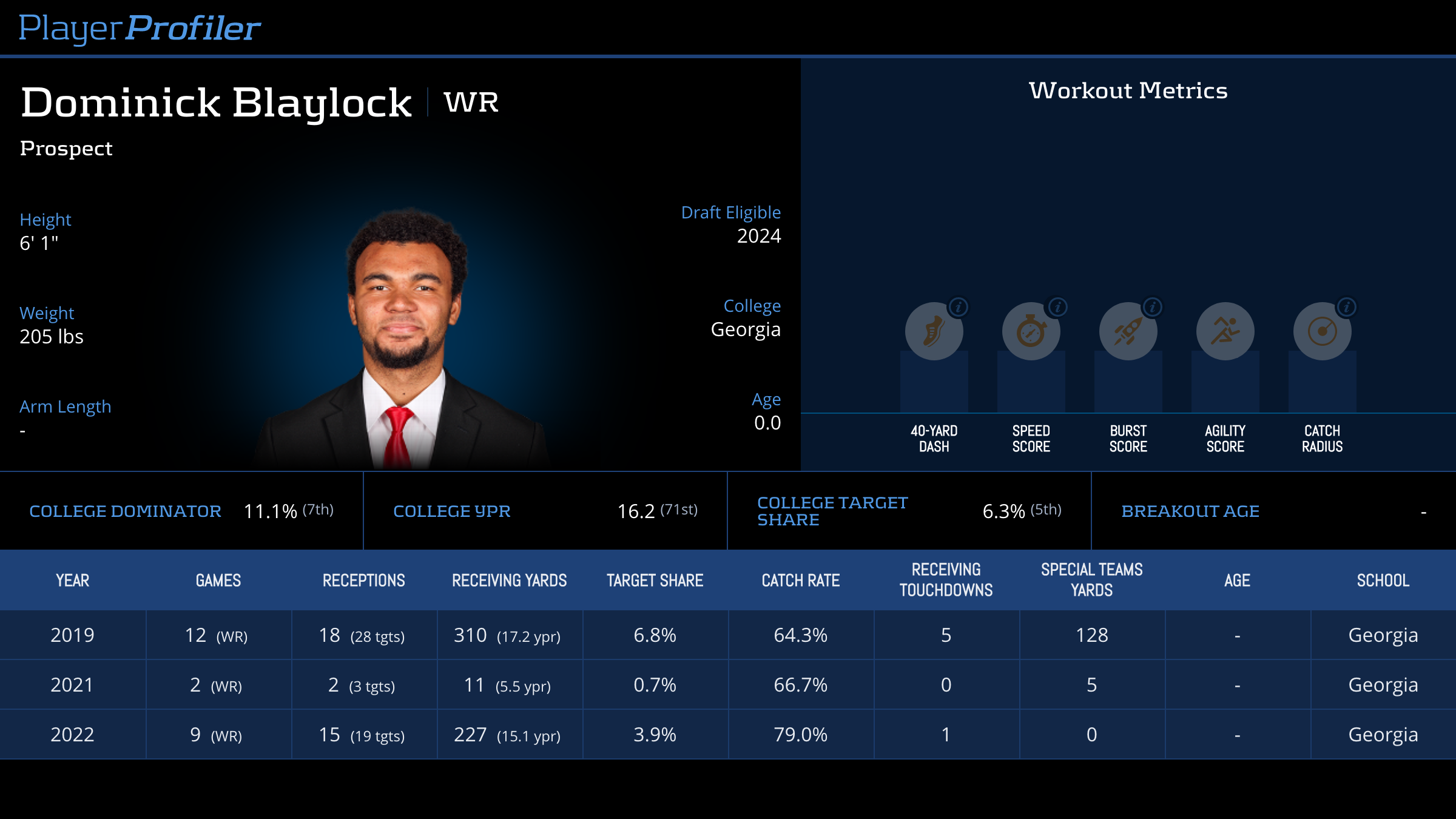 | Year Year | Games Games | Receptions Recs | Receiving Yards Rec Yds | Target Share Tgt Share | Catch Rate Catch Rate | Receiving Touchdowns Rec TDs | Special Teams Yards Special Teams | Age Age | School School |
