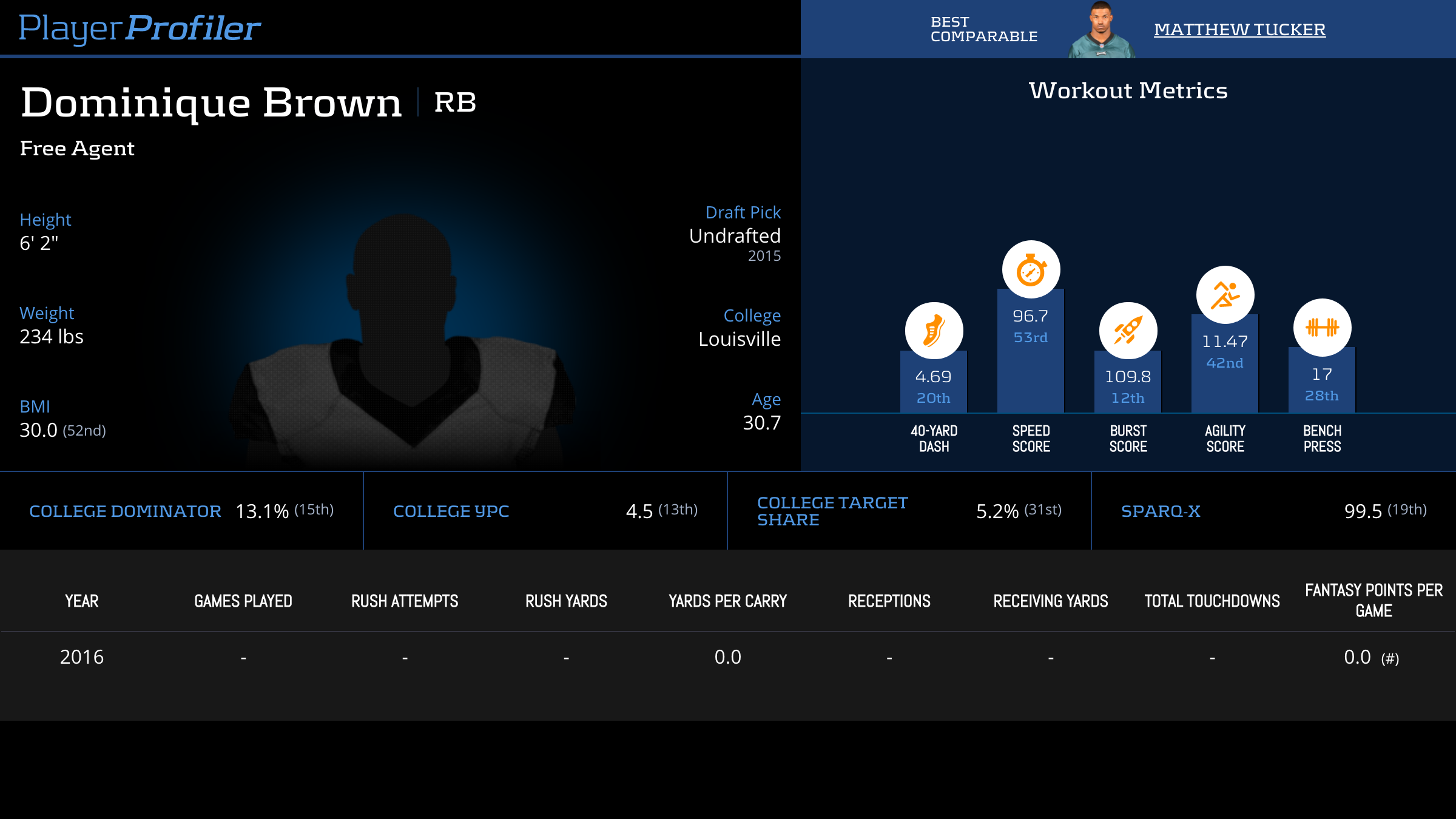 | Year Year | Games Games | Rush Attempts Rush Atts | Rushing Yards Rush Yrds | Total Touchdowns TDs | Receptions Rec | Receiving Yards Rec Yrds | Target Share Tgt Share | Age Age | School School |