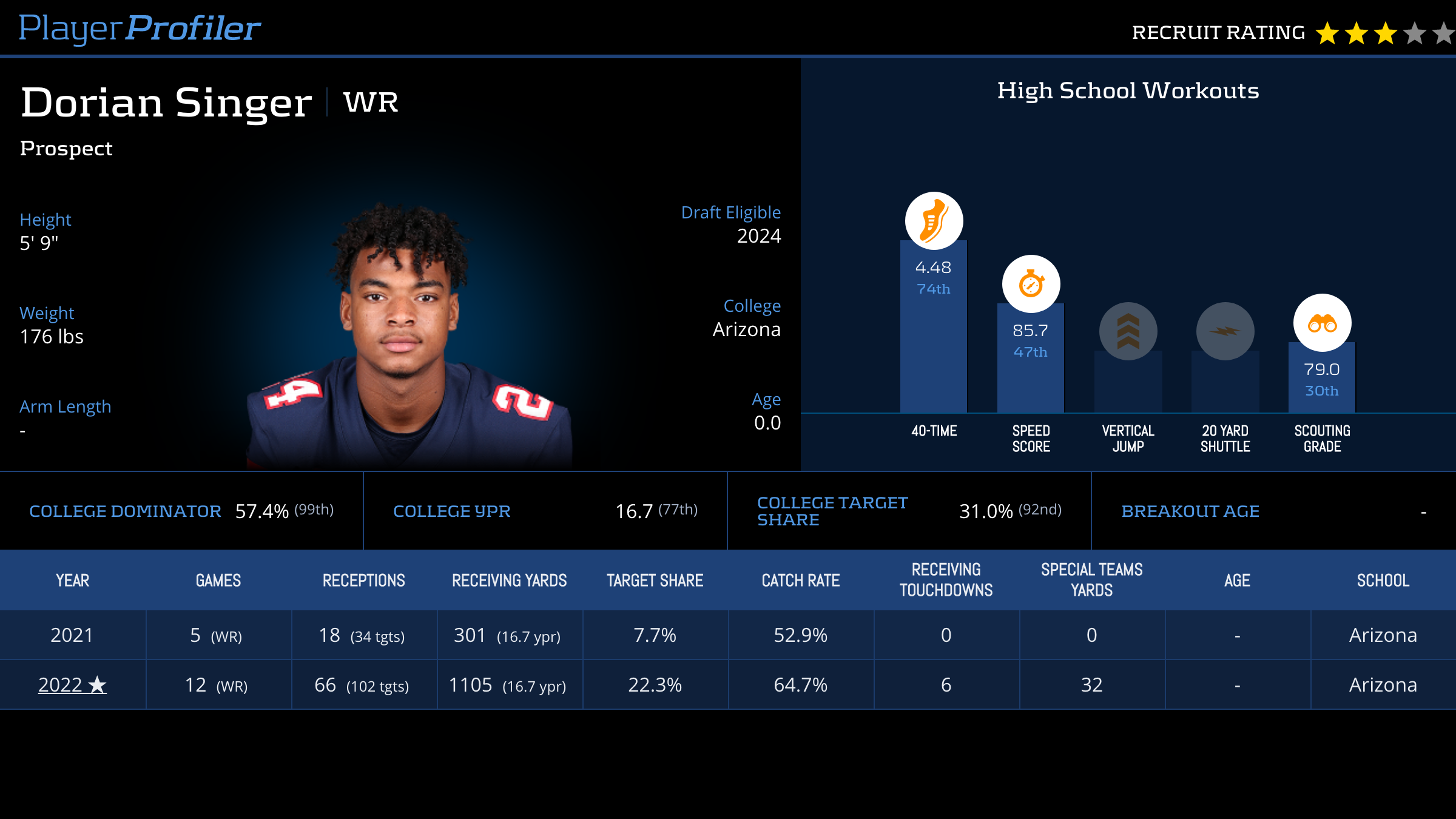 | Year Year | Games Games | Receptions Recs | Receiving Yards Rec Yds | Target Share Tgt Share | Catch Rate Catch Rate | Receiving Touchdowns Rec TDs | Special Teams Yards Special Teams | Age Age | School School |