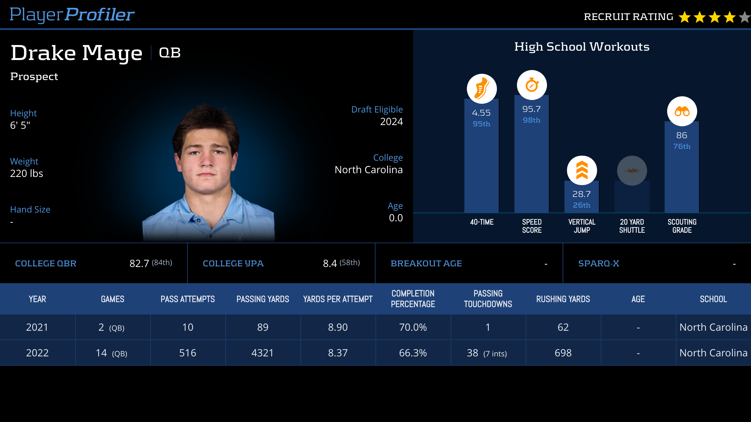 | Year Year | Games Games | Pass Attempts Pass Atts | Passing Yards Pass Yds | Yards Per Attempt YPA | Completion Percentage Comp % | Passing Touchdowns Pass TDs | Rushing Yards Rush Yds | Age Age | School School |