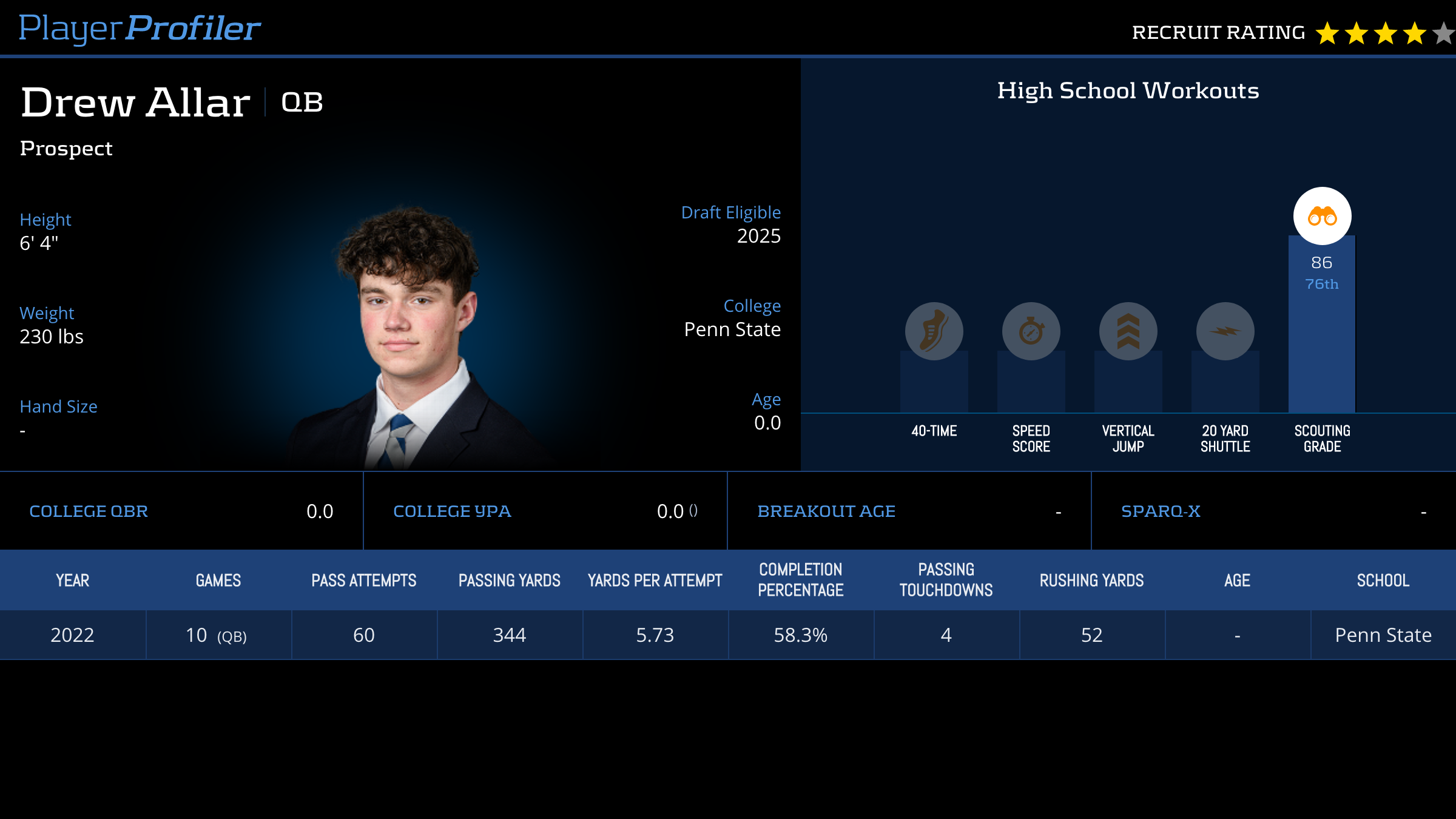 | Year Year | Games Games | Pass Attempts Pass Atts | Passing Yards Pass Yds | Yards Per Attempt YPA | Completion Percentage Comp % | Passing Touchdowns Pass TDs | Rushing Yards Rush Yds | Age Age | School School |