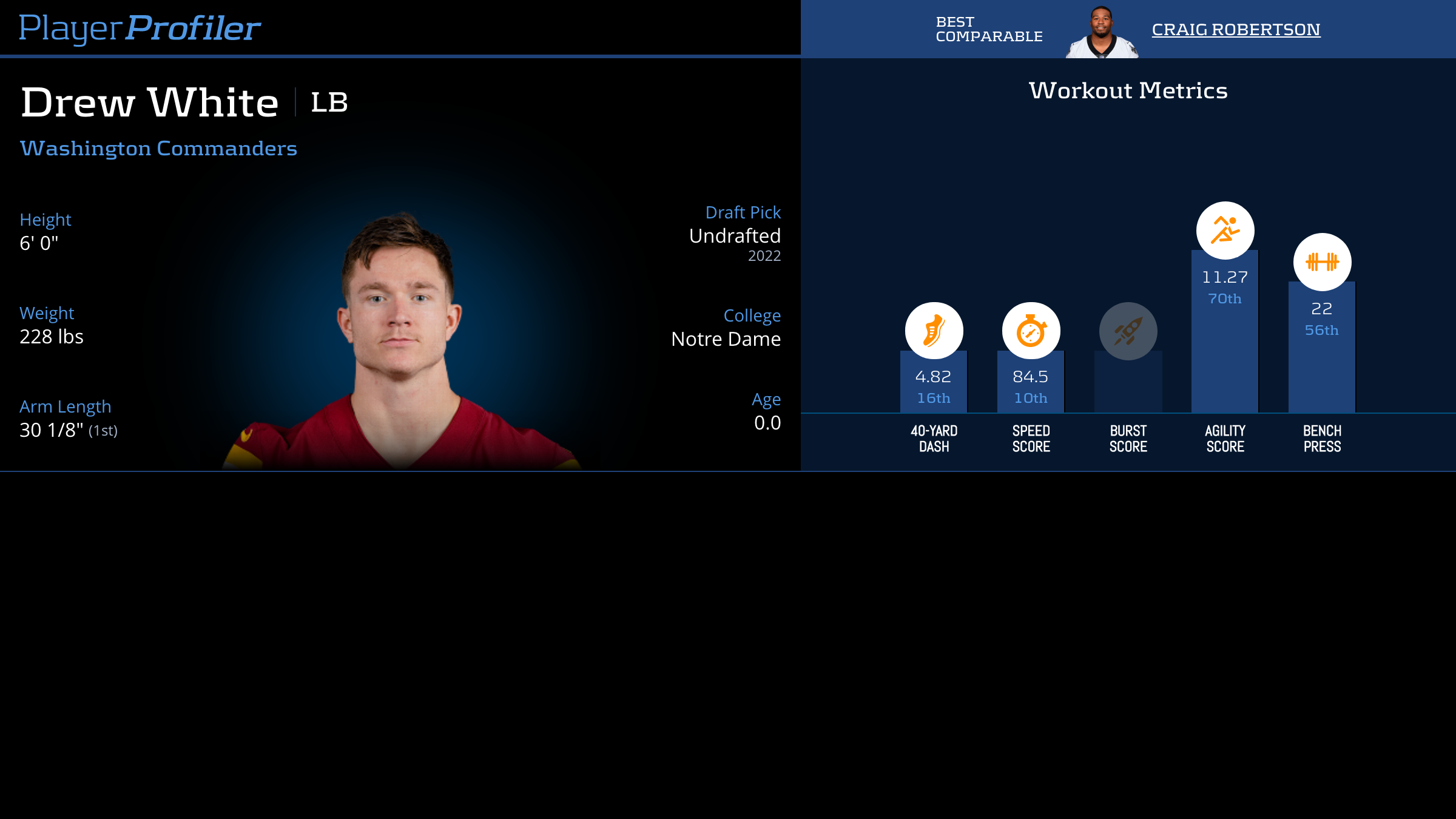 Download all Drew White advanced stats and metrics with Data Analysis.