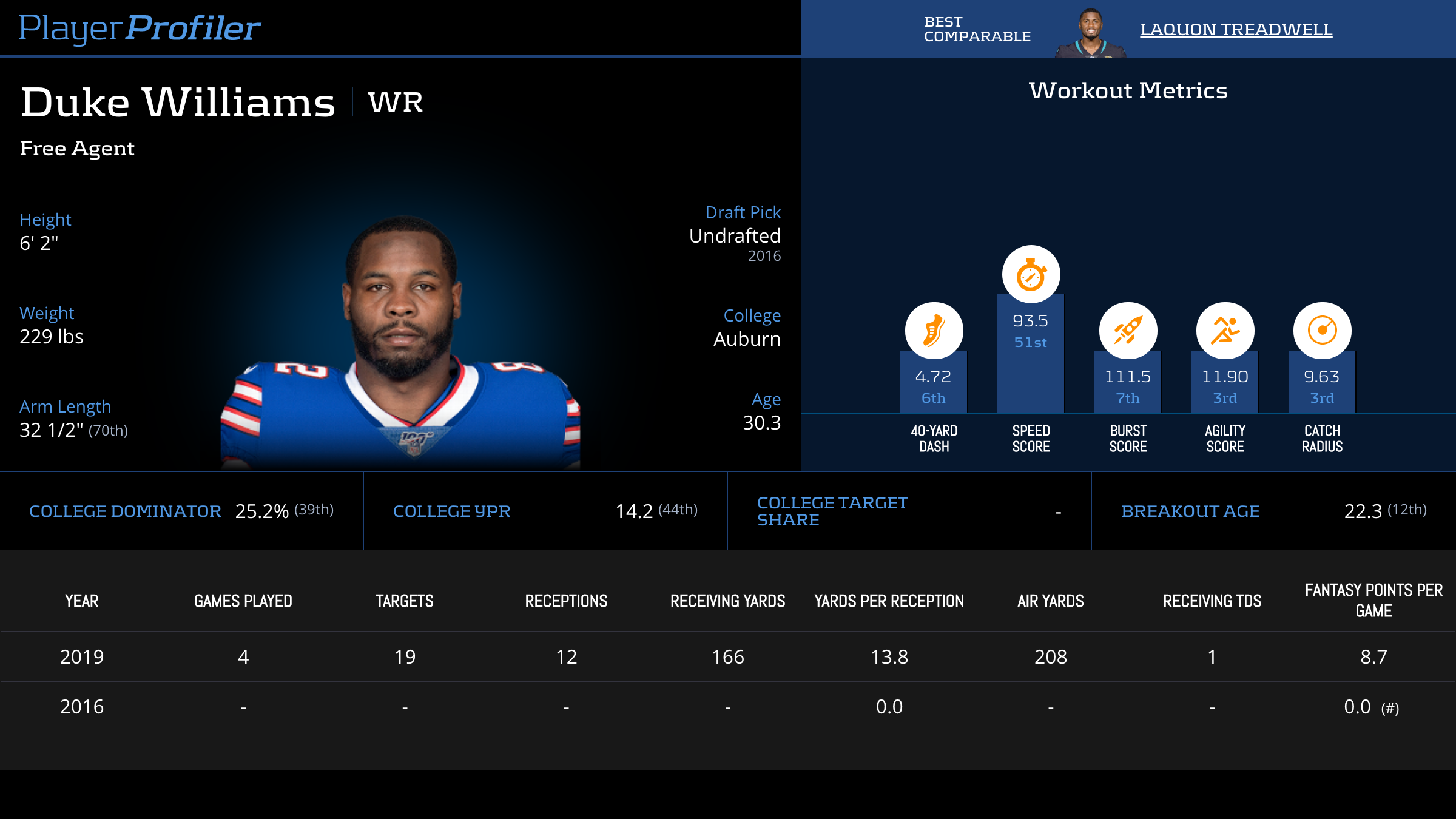 Box score statistics such as targets, yards, touchdowns, and fantasy points per target are updated the next day. Advanced stats and metrics are updated later in the week during the NFL season.