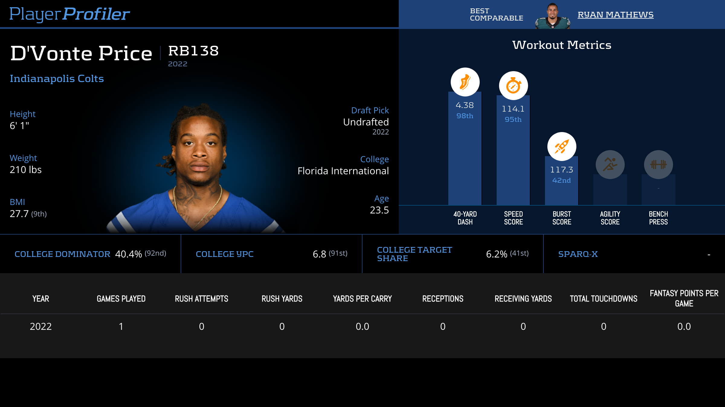 | Year Year | Games Games | Rush Attempts Rush Atts | Rushing Yards Rush Yrds | Total Touchdowns TDs | Receptions Rec | Receiving Yards Rec Yrds | Target Share Tgt Share | Age Age | School School |