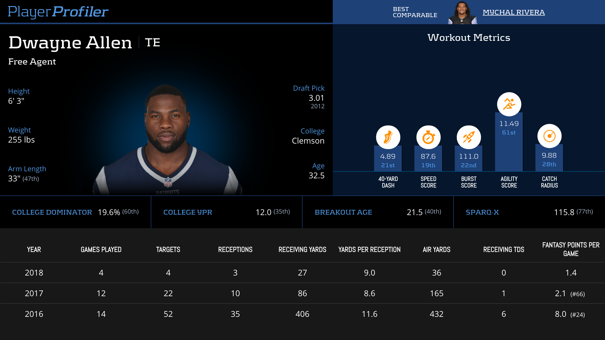 Box score statistics such as targets, yards, touchdowns, and fantasy points per target are updated the next day. Advanced stats and metrics are updated later in the week during the NFL season.