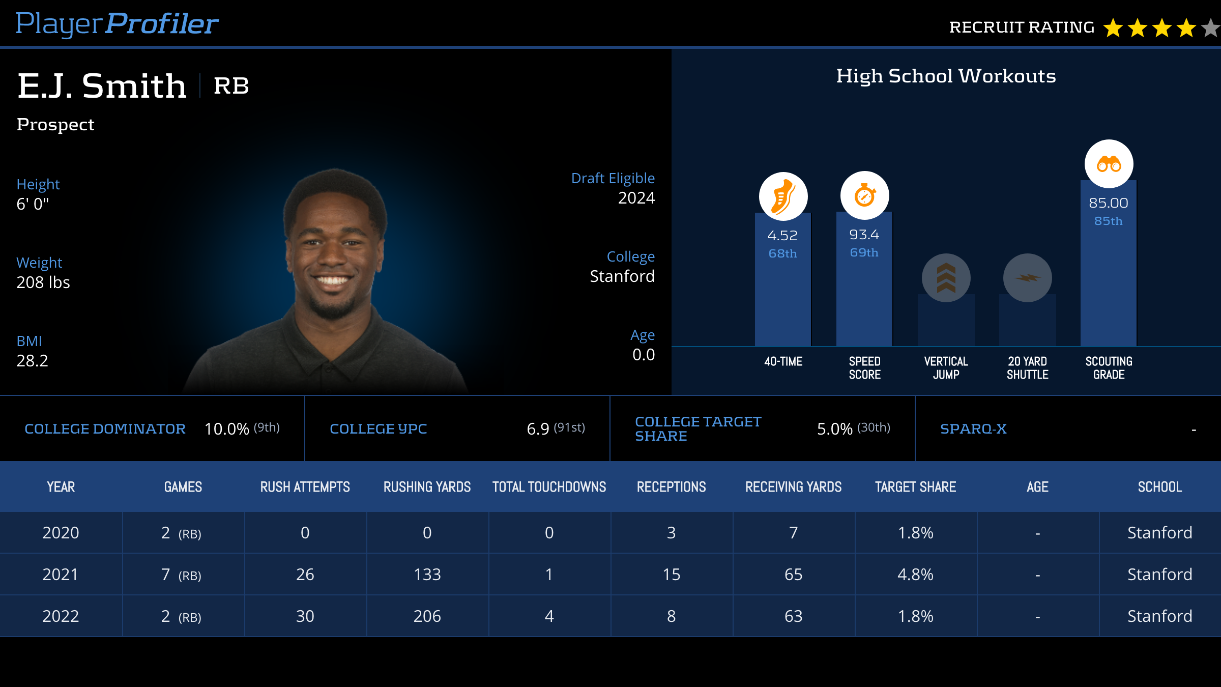 | Year Year | Games Games | Rush Attempts Rush Atts | Rushing Yards Rush Yrds | Total Touchdowns TDs | Receptions Rec | Receiving Yards Rec Yrds | Target Share Tgt Share | Age Age | School School |