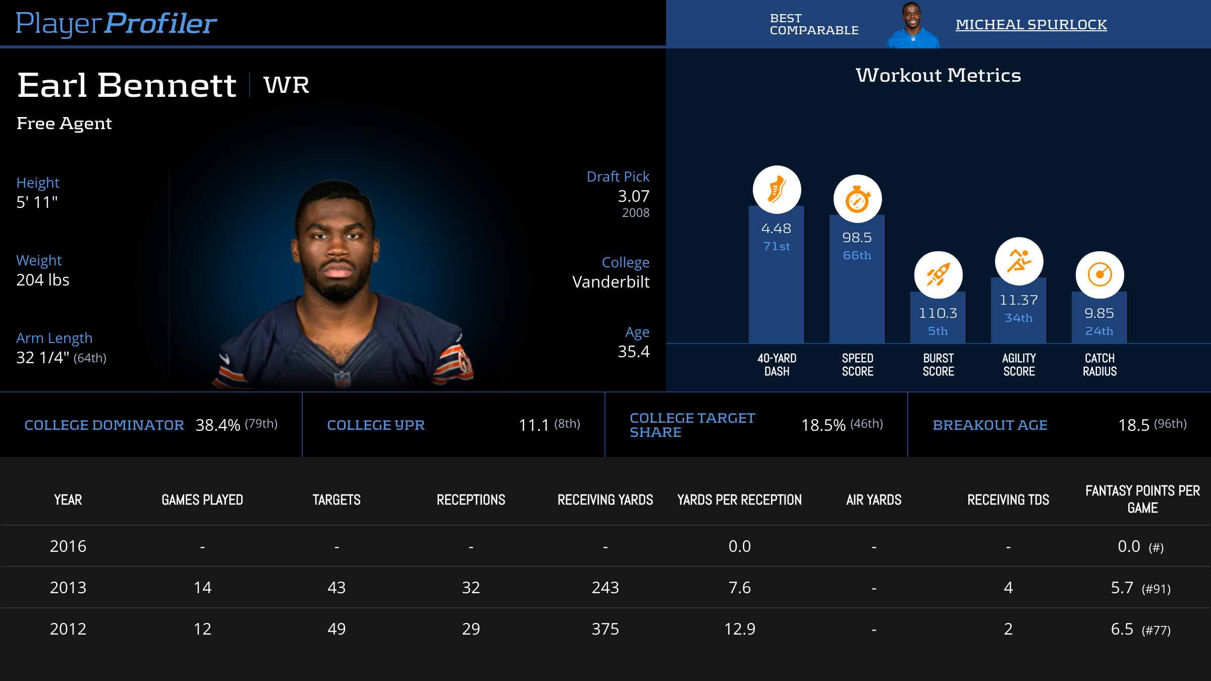 | Year Year | Games Games | Receptions Recs | Receiving Yards Rec Yds | Target Share Tgt Share | Catch Rate Catch Rate | Receiving Touchdowns Rec TDs | Special Teams Yards Special Teams | Age Age | School School |