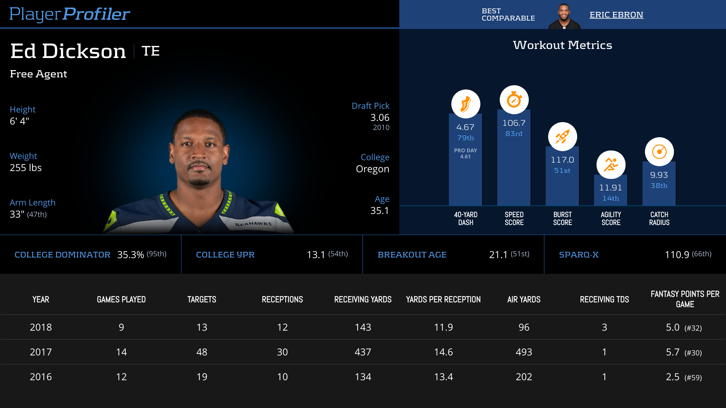 | Year Year | Games Games | Receptions Recs | Receiving Yards Rec Yds | Target Share Tgt Share | Catch Rate Catch Rate | Receiving Touchdowns Rec TDs | Special Teams Yards Special Teams | Age Age | School School |