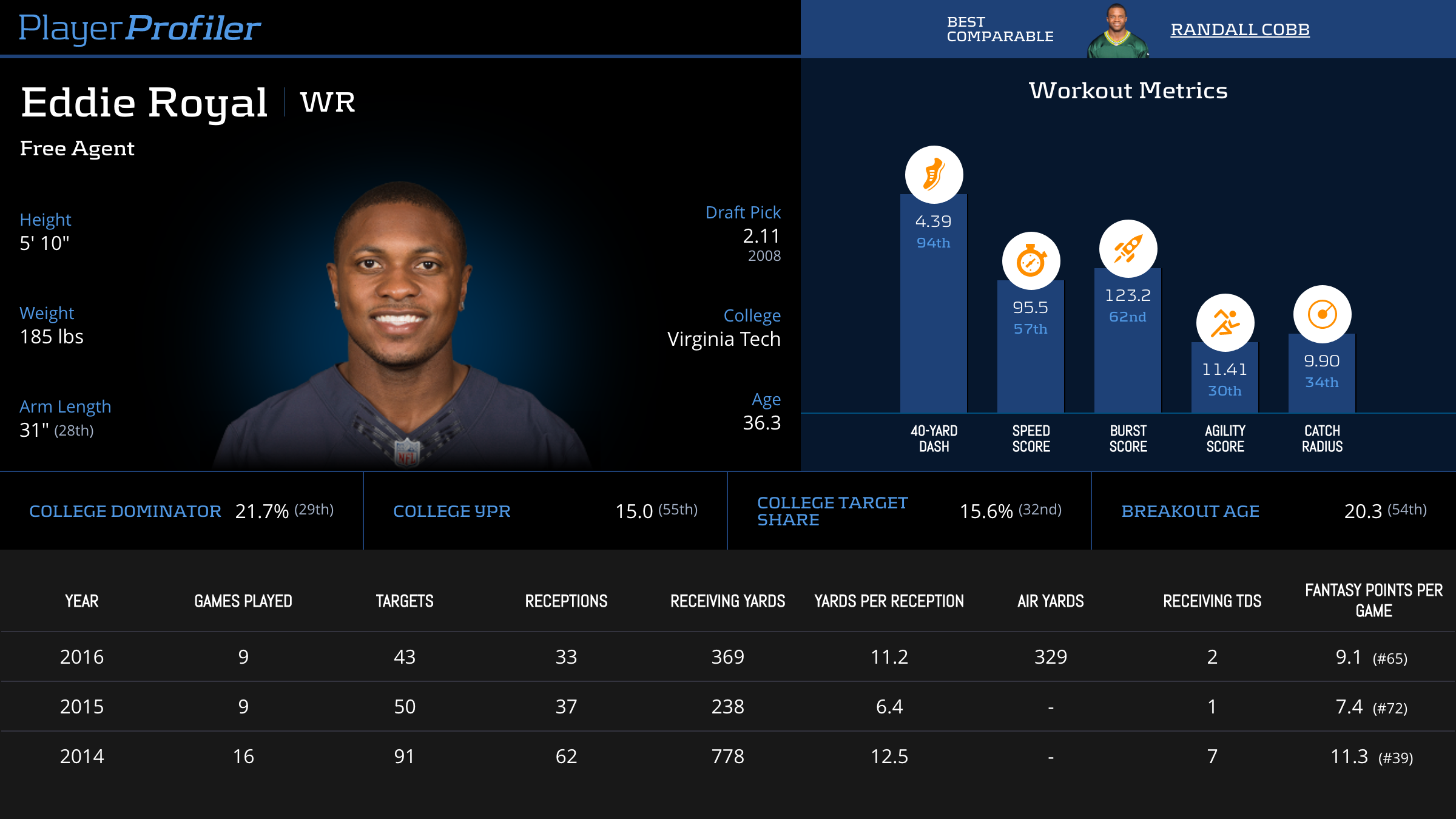 Box score statistics such as targets, yards, touchdowns, and fantasy points per target are updated the next day. Advanced stats and metrics are updated later in the week during the NFL season.
