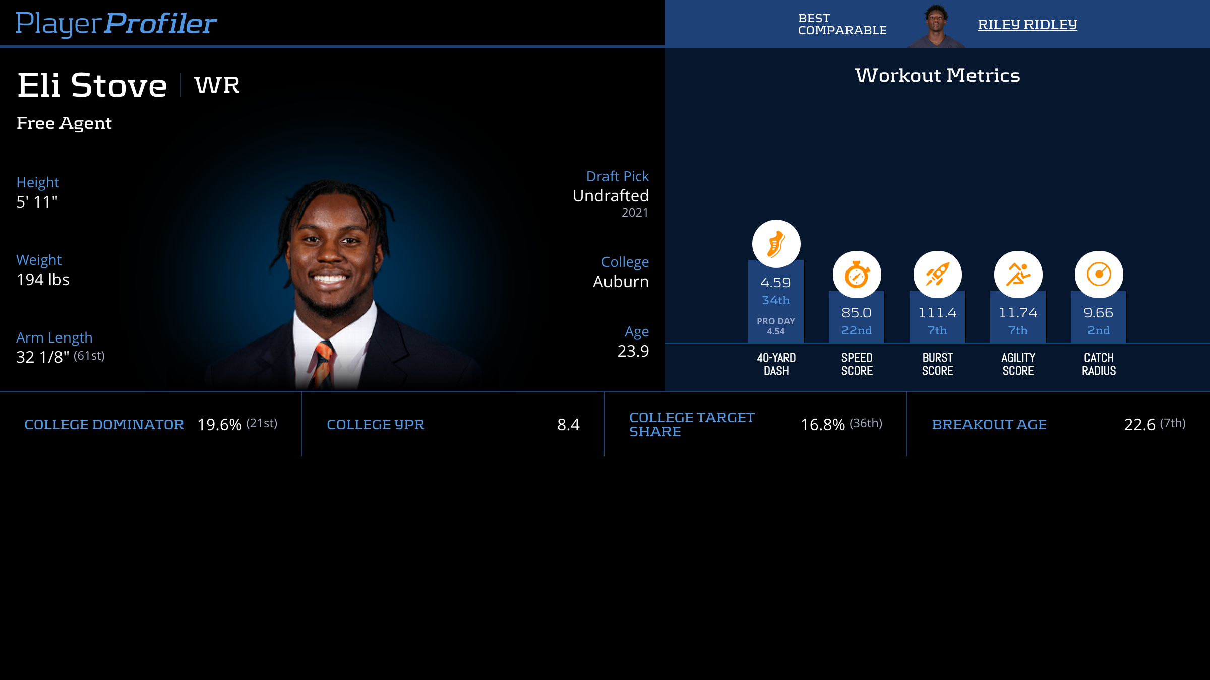 | Year Year | Games Games | Receptions Recs | Receiving Yards Rec Yds | Target Share Tgt Share | Catch Rate Catch Rate | Receiving Touchdowns Rec TDs | Special Teams Yards Special Teams | Age Age | School School |