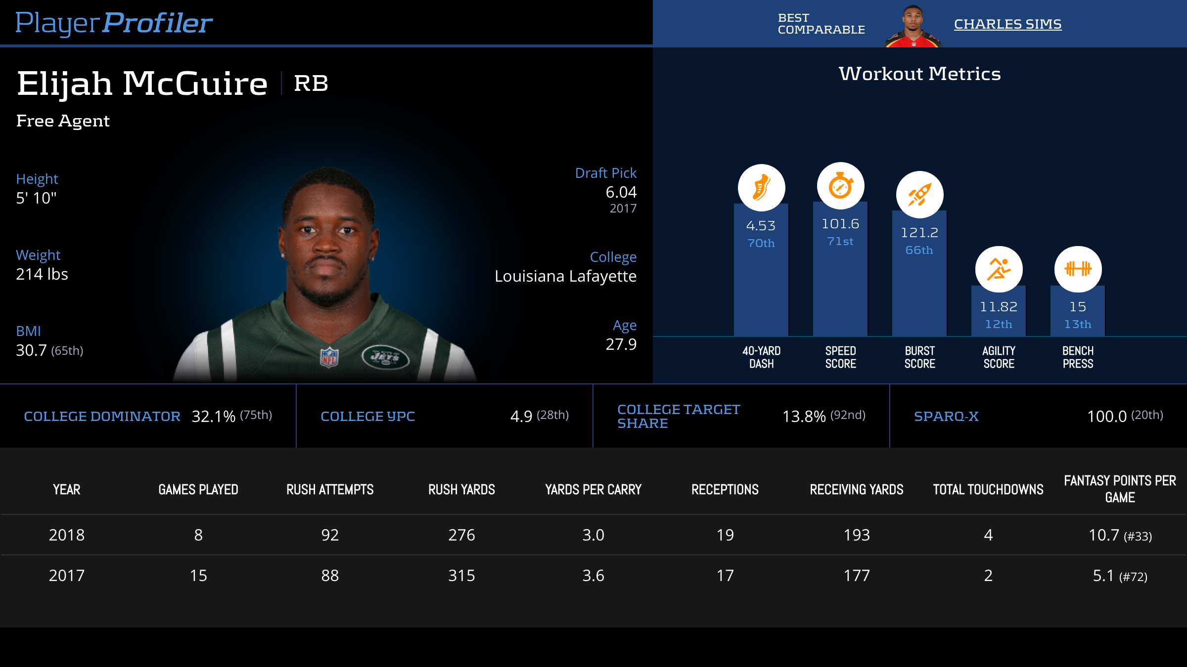 | Year Year | Games Games | Rush Attempts Rush Atts | Rushing Yards Rush Yrds | Total Touchdowns TDs | Receptions Rec | Receiving Yards Rec Yrds | Target Share Tgt Share | Age Age | School School |
