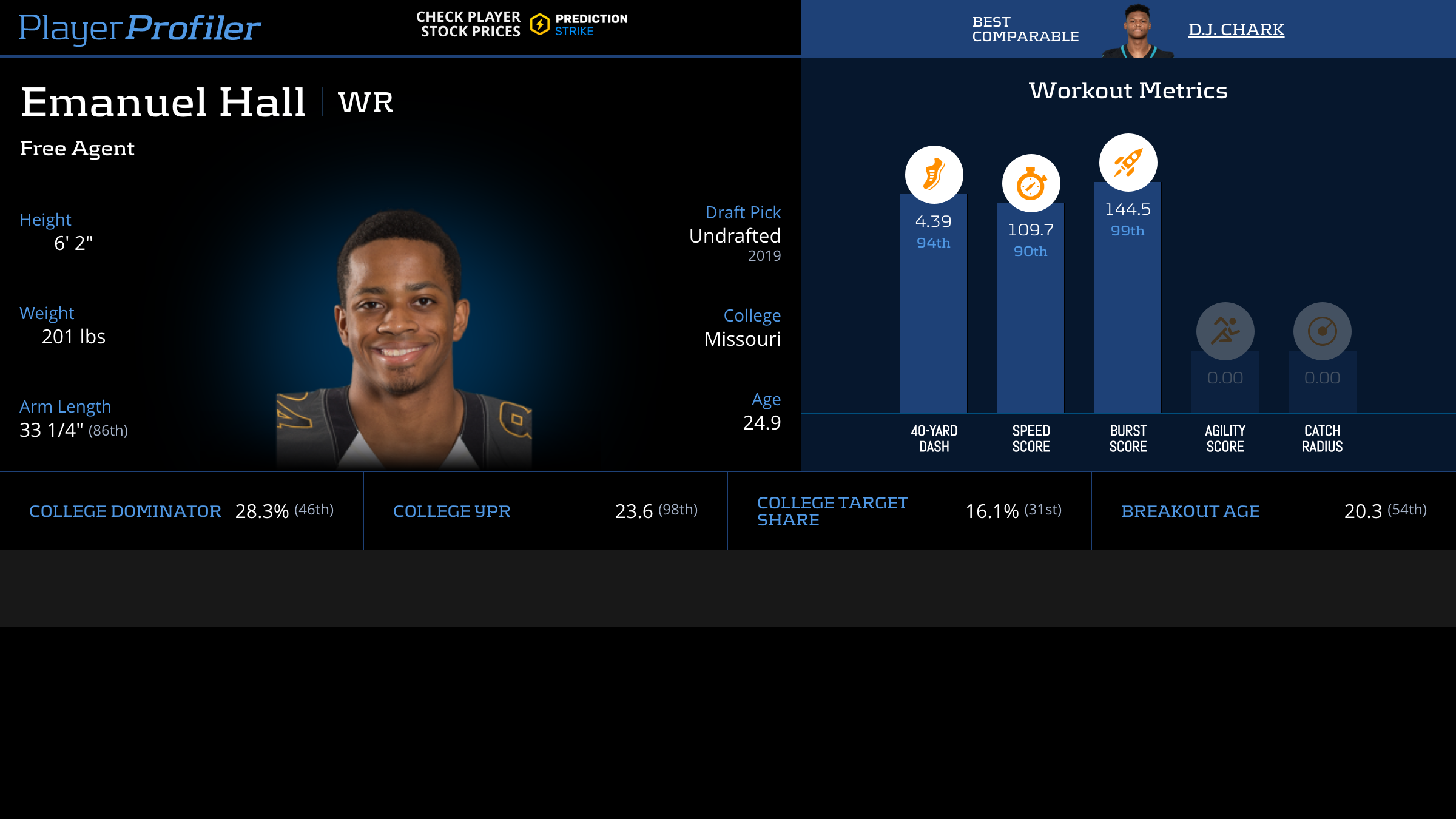 | Year Year | Games Games | Receptions Recs | Receiving Yards Rec Yds | Target Share Tgt Share | Catch Rate Catch Rate | Receiving Touchdowns Rec TDs | Special Teams Yards Special Teams | Age Age | School School |