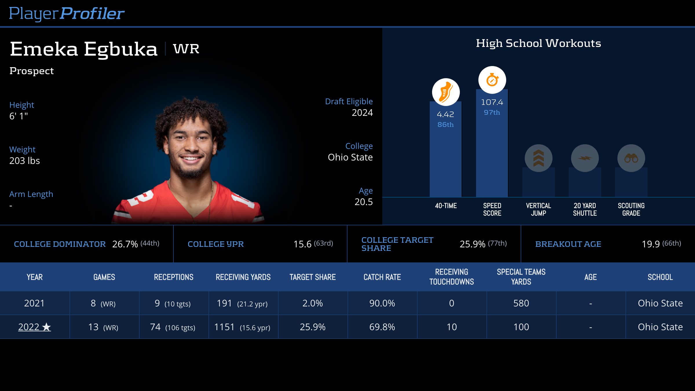 | Year Year | Games Games | Receptions Recs | Receiving Yards Rec Yds | Target Share Tgt Share | Catch Rate Catch Rate | Receiving Touchdowns Rec TDs | Special Teams Yards Special Teams | Age Age | School School |