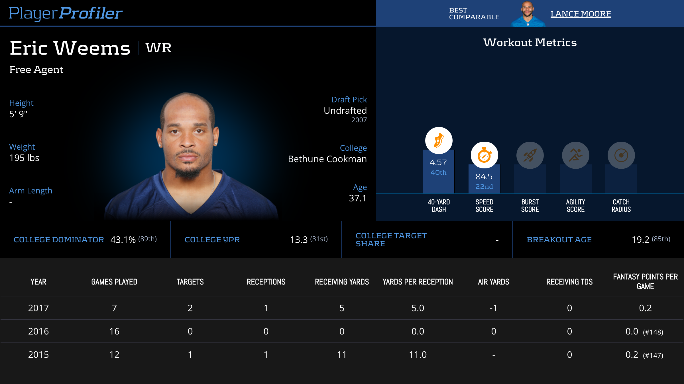 Year Games Tgts Rec Rec Yds YPR Air Yds Rec TD Fantasy Pts/Game