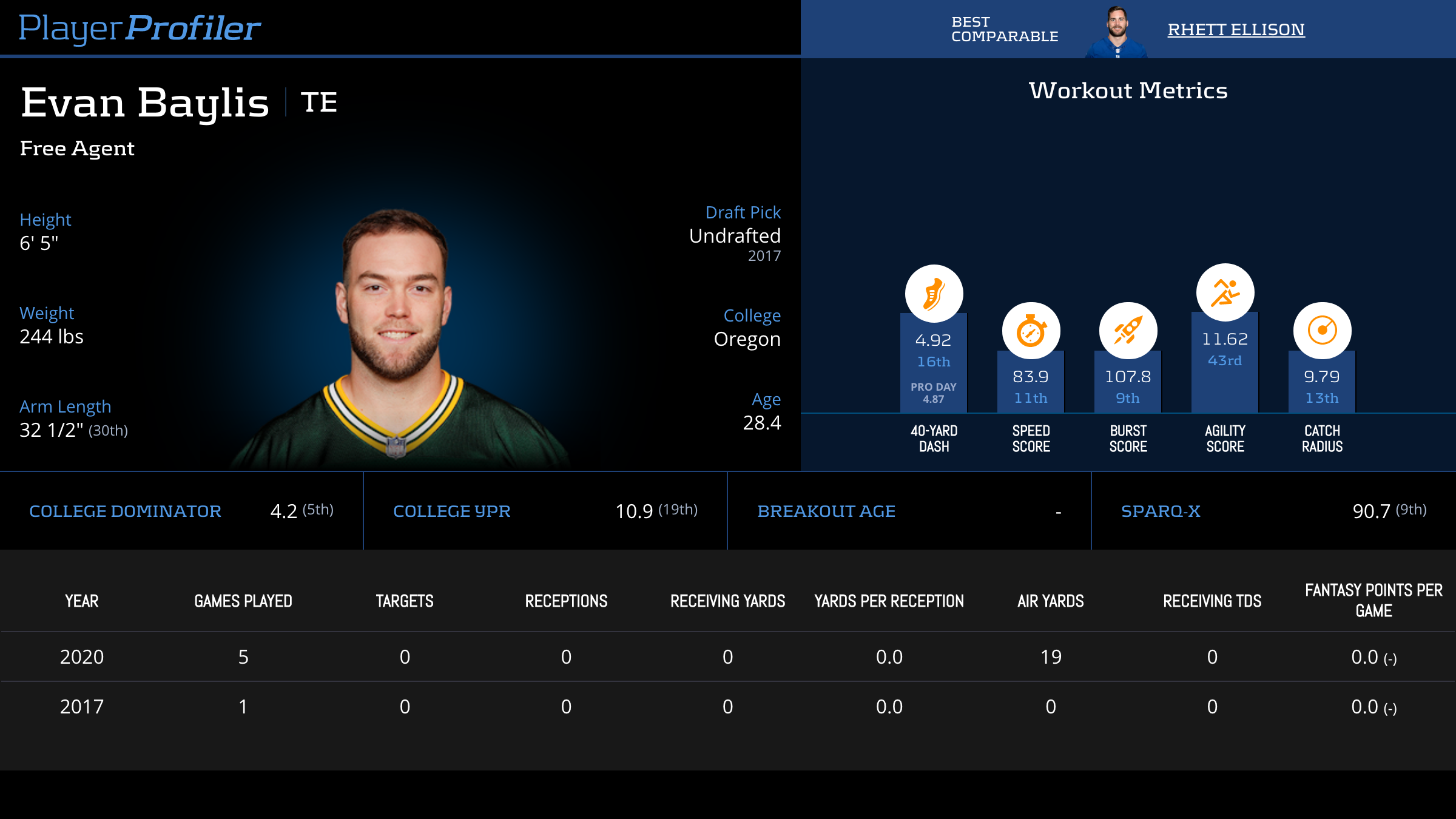 | Year Year | Games Games | Receptions Recs | Receiving Yards Rec Yds | Target Share Tgt Share | Catch Rate Catch Rate | Receiving Touchdowns Rec TDs | Special Teams Yards Special Teams | Age Age | School School |