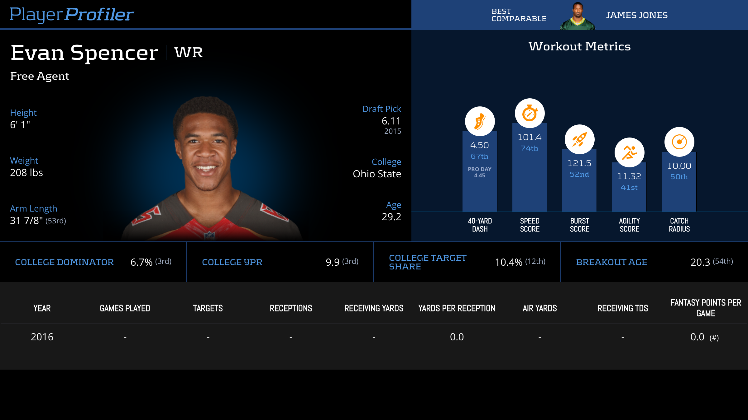 | Year Year | Games Games | Receptions Recs | Receiving Yards Rec Yds | Target Share Tgt Share | Catch Rate Catch Rate | Receiving Touchdowns Rec TDs | Special Teams Yards Special Teams | Age Age | School School |