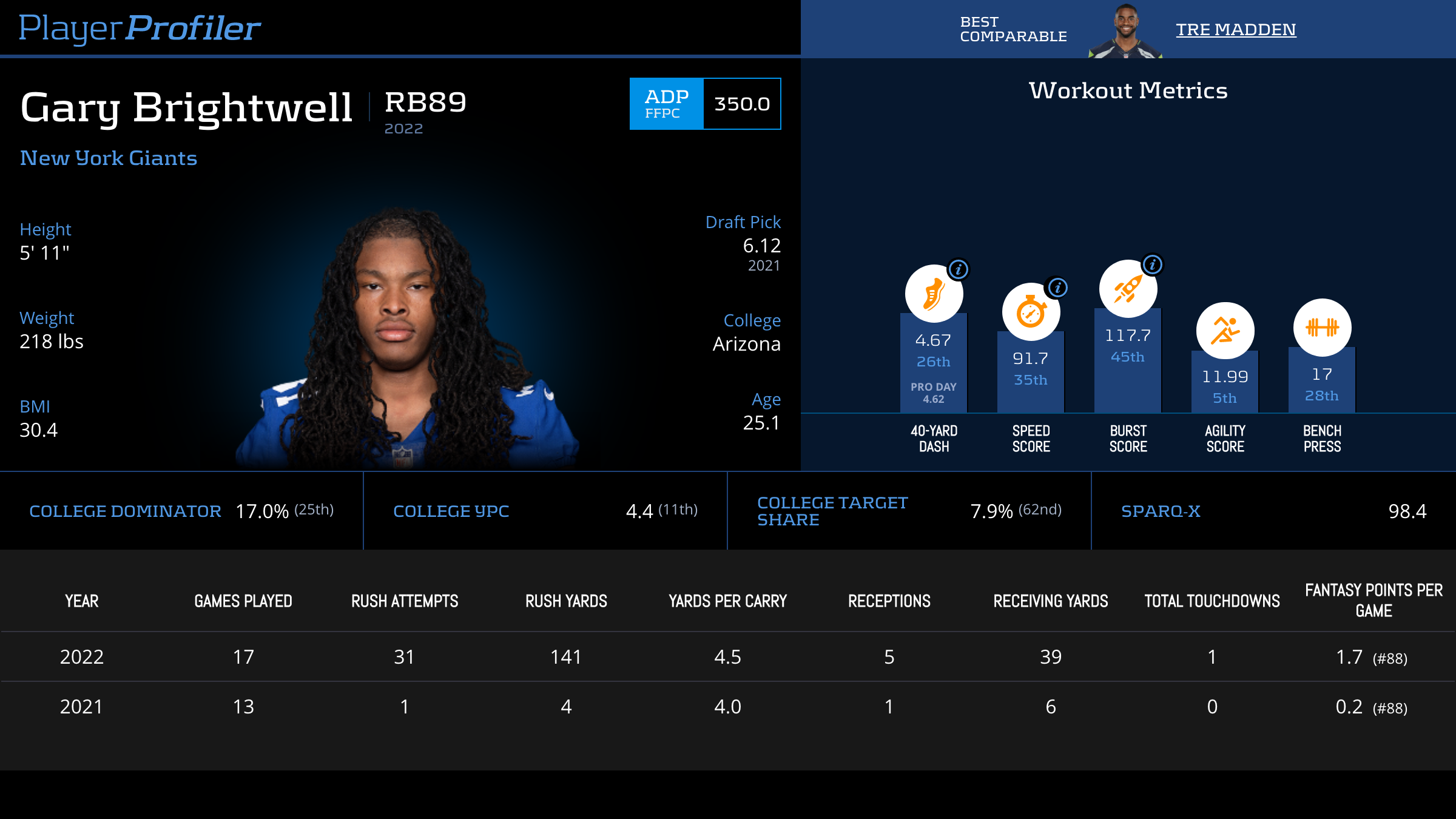 | Year Year | Games Games | Rush Attempts Rush Atts | Rushing Yards Rush Yrds | Total Touchdowns TDs | Receptions Rec | Receiving Yards Rec Yrds | Target Share Tgt Share | Age Age | School School |