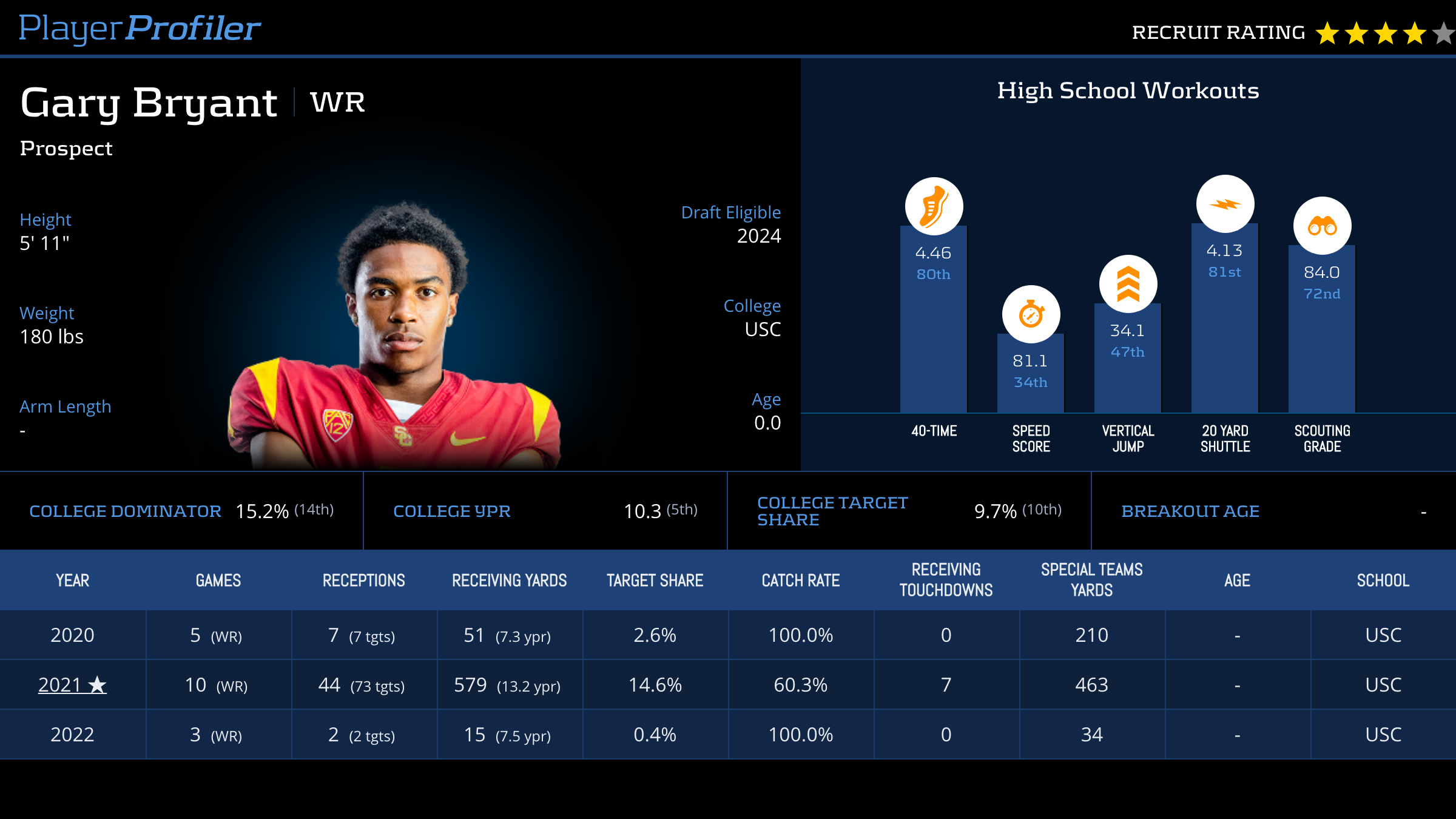 | Year Year | Games Games | Receptions Recs | Receiving Yards Rec Yds | Target Share Tgt Share | Catch Rate Catch Rate | Receiving Touchdowns Rec TDs | Special Teams Yards Special Teams | Age Age | School School |