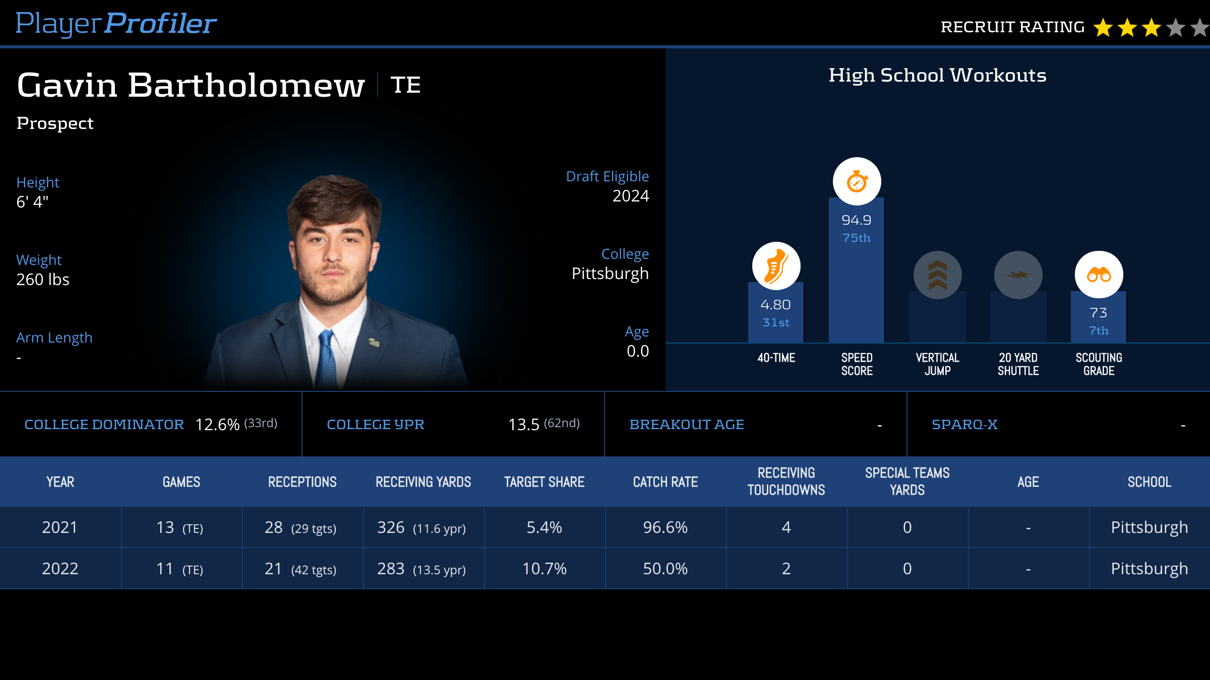 | Year Year | Games Games | Receptions Recs | Receiving Yards Rec Yds | Target Share Tgt Share | Catch Rate Catch Rate | Receiving Touchdowns Rec TDs | Special Teams Yards Special Teams | Age Age | School School |