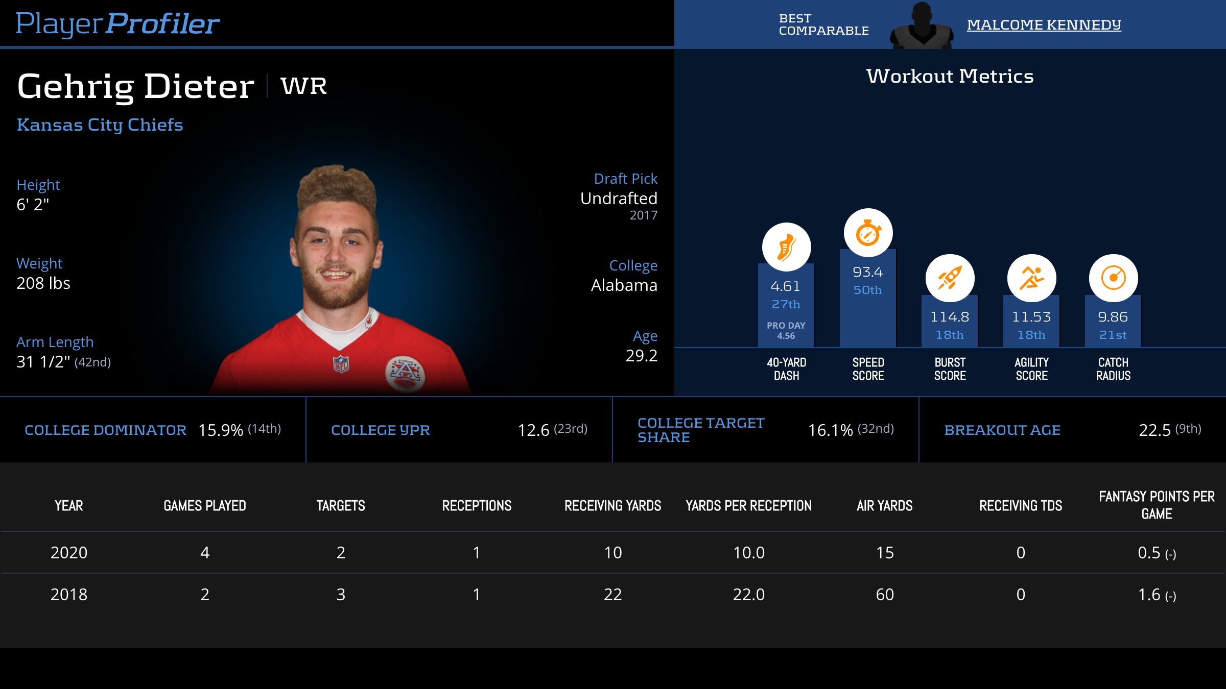 | Year Year | Games Games | Receptions Recs | Receiving Yards Rec Yds | Target Share Tgt Share | Catch Rate Catch Rate | Receiving Touchdowns Rec TDs | Special Teams Yards Special Teams | Age Age | School School |